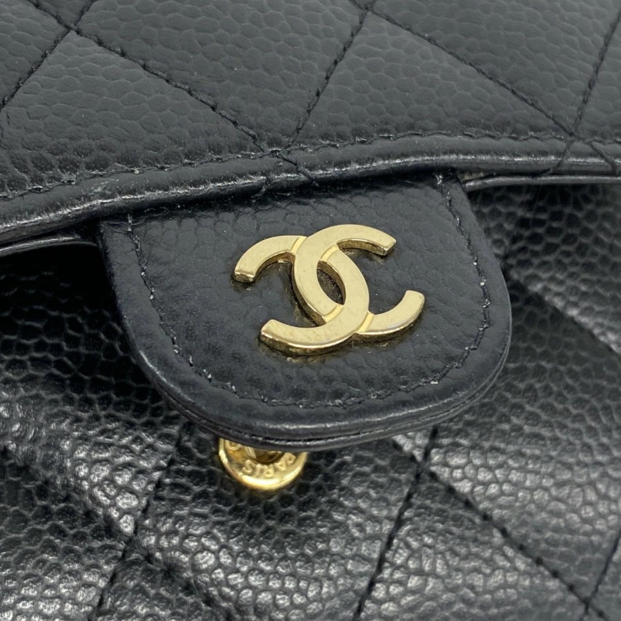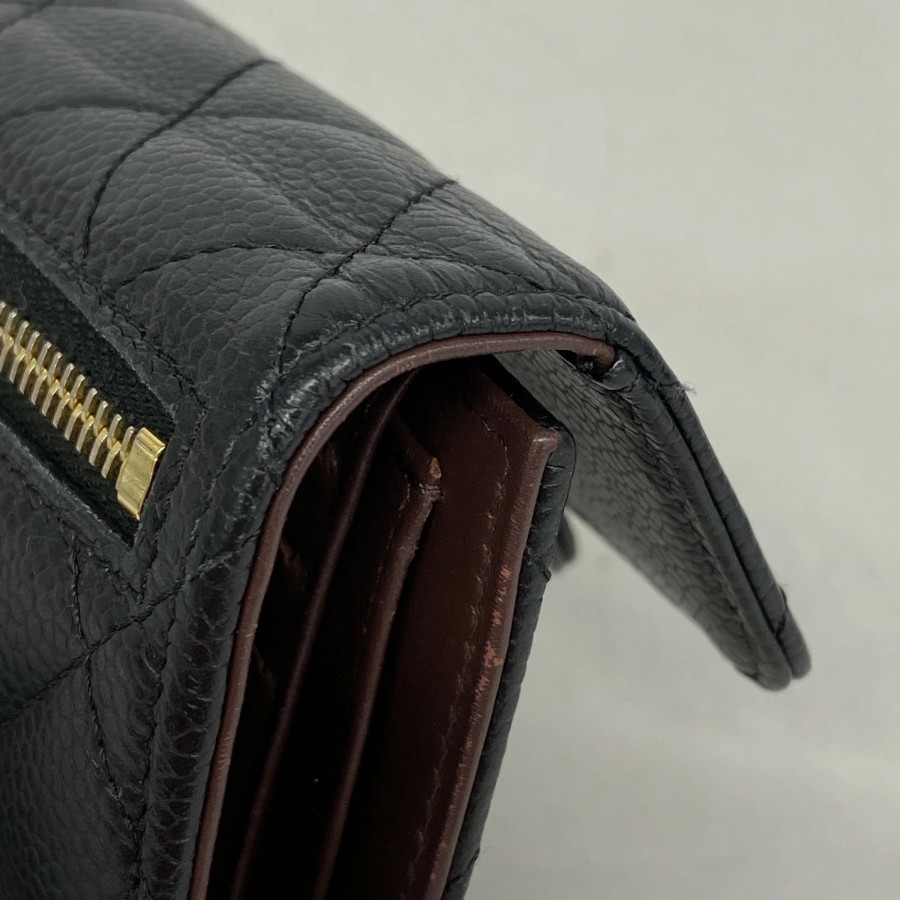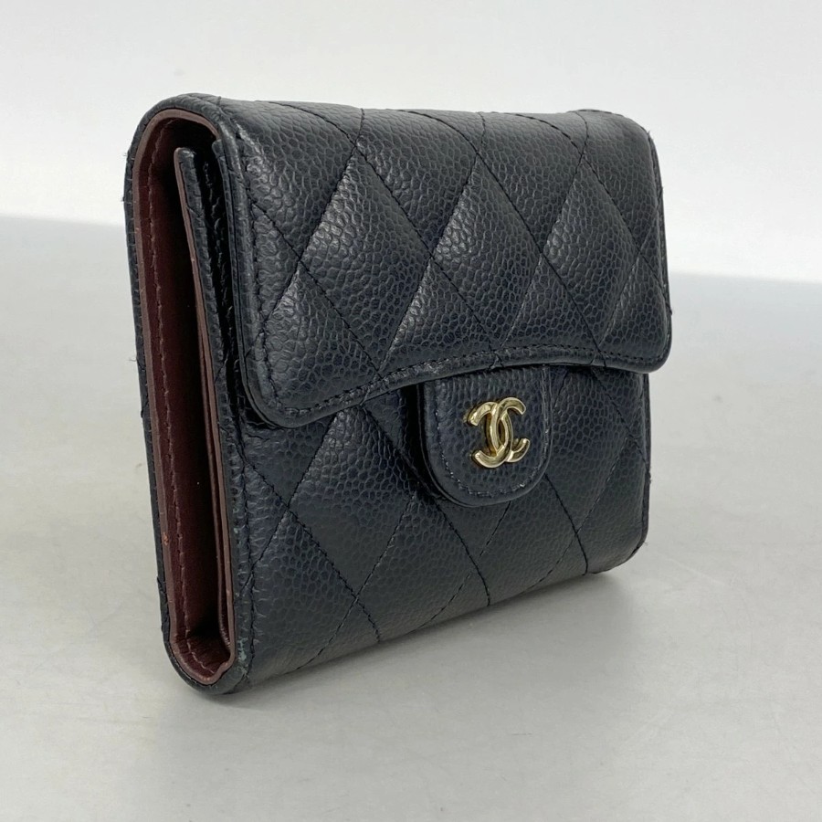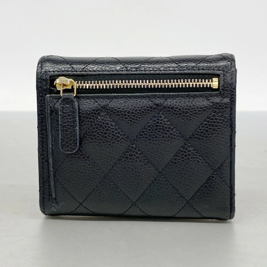 【6dd5494】シャネル 三つ折り財布 マトラッセ キャビアスキン ブラック ゴールド金具【中古】レディース