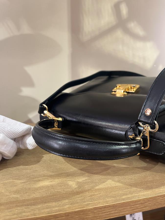 艶やかなブラックレザーに、アイコニックなゴールドのロック金具と鍵付きチャームが高級感を演出。