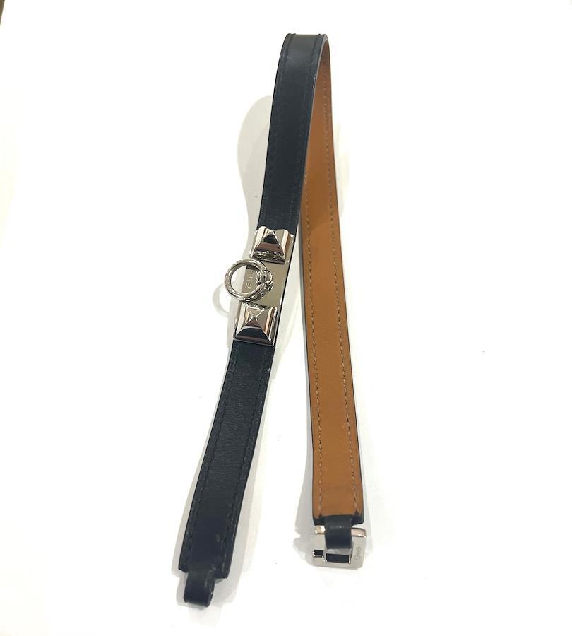 シックなブラックレザーに、エルメスらしいピラミッド型のメドールスタッズとセンターリングが映えるデザイン。全長約35cmタイプで、華奢な手首にも美しくフィットします。