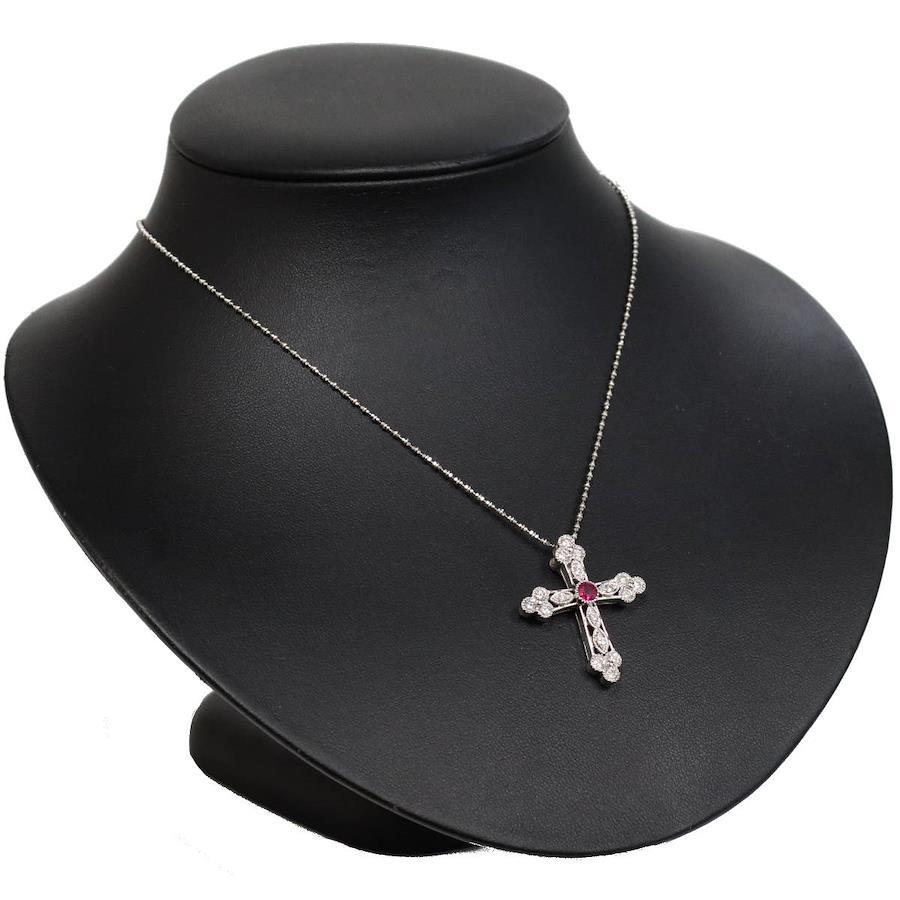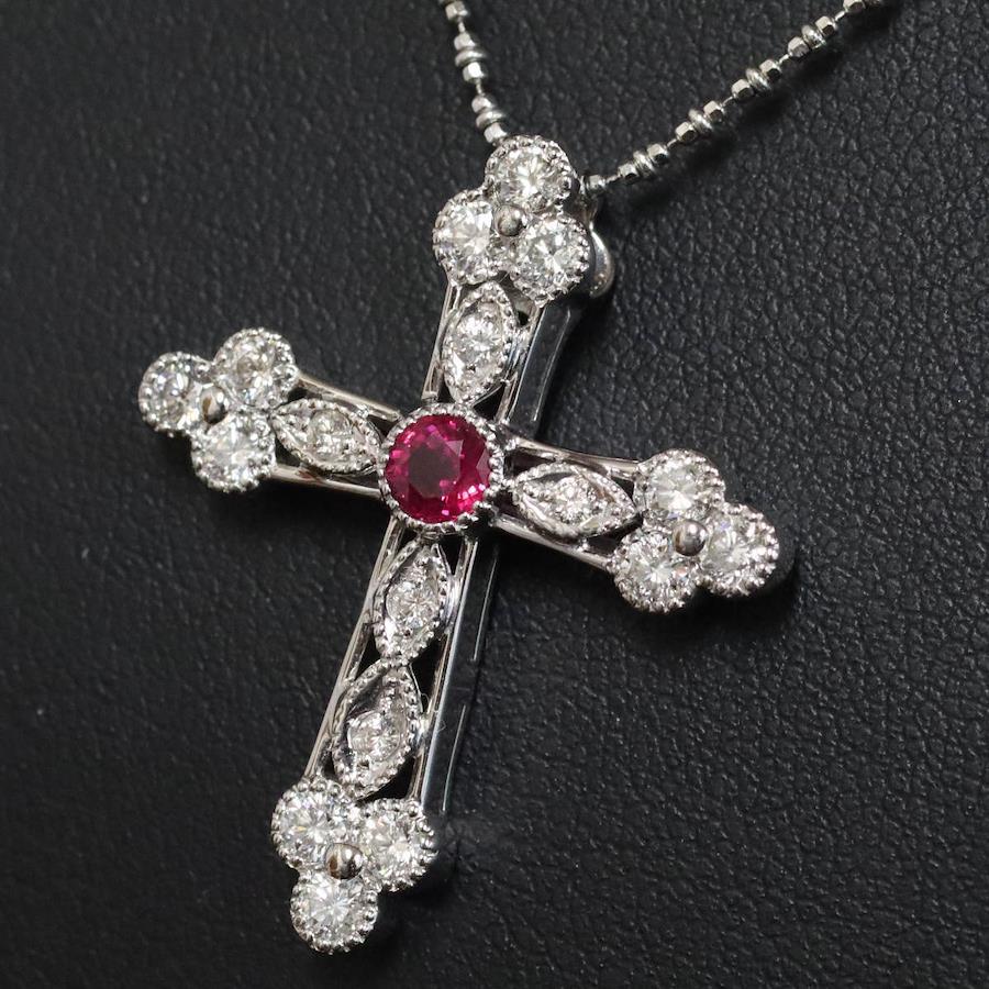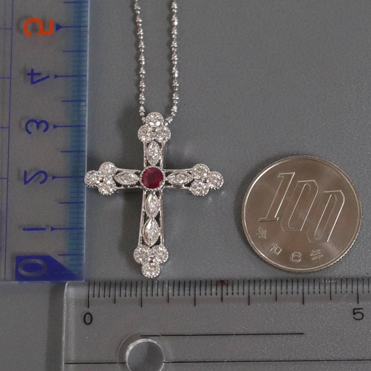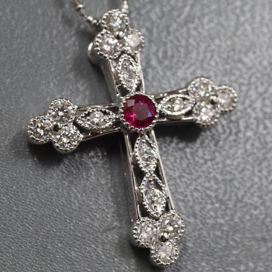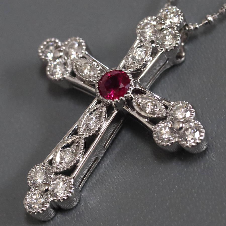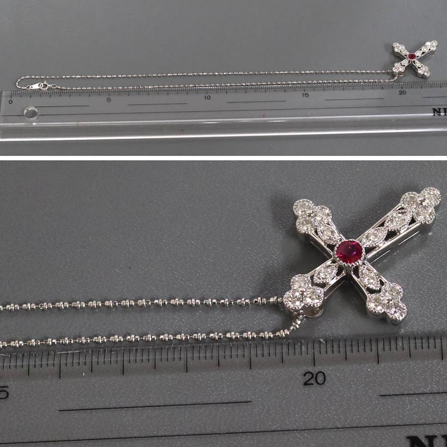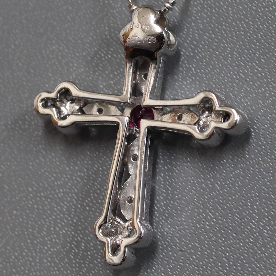 K18WGダイヤモンドルビーペンダントの中古品です。大振りのクロスが存在感を発揮します。チェーンが3.0g、トップが6.2gです。ダイヤモンドはややインクルージョンがあるものの肉眼では見えません。ダイヤモンドは照りがあります。ルビーは紫がかった赤色です。わずかにインクルージョンがあり、表面にわずかに天然の欠けがありますが肉眼ではわかりません。地金には小傷があります。+---+---+---+---+---+。{状態}AB{素材}トップK18WG,ダイヤモンド,ルビーチェーンK18WG{サイズ}トップ約W26mm × H31mm。チェーン長約39cm。{その他}D1.00ct,R0.34ct,9.2g。{付属品}なし(サービス箱をお付けします){お問合せ商品番号}25096044+---+---+---+---+---+。