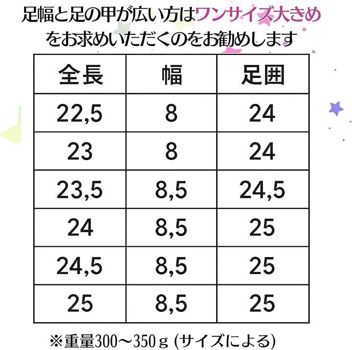 サイズ:22.5 全長:22.5cm 幅:8cm 足囲:24cm/23 全長:23cm 幅:8cm 足囲:24cm/23.5 全長:23.5cm 幅:8.5cm 足囲:24.5cm/24 全長:24cm 幅:8.5cm 足囲:25cm/24.5 全長:24.5cm 幅:8.5cm 足囲:25cm/25 全長:25cm 幅:8.5cm 足囲:25cm *平置き採寸の為、多少の誤差が生じる場合がございます。