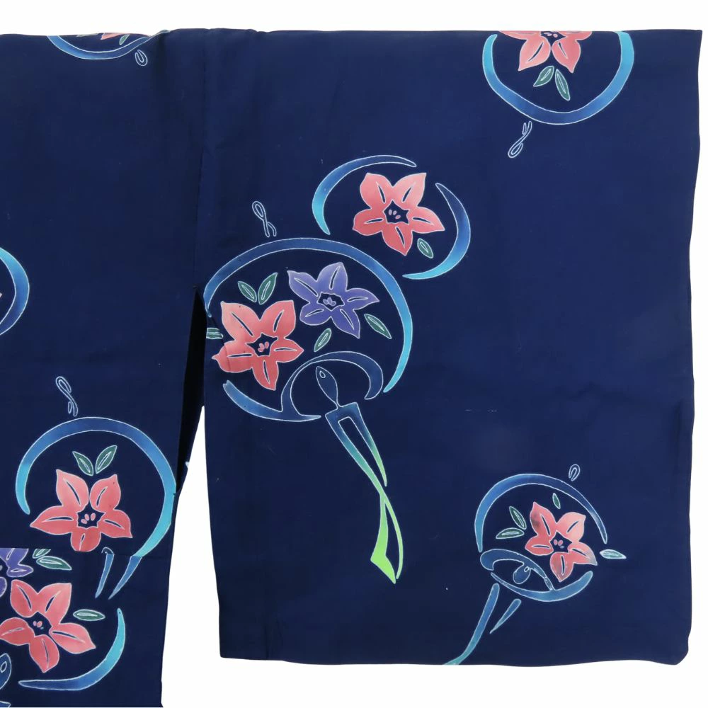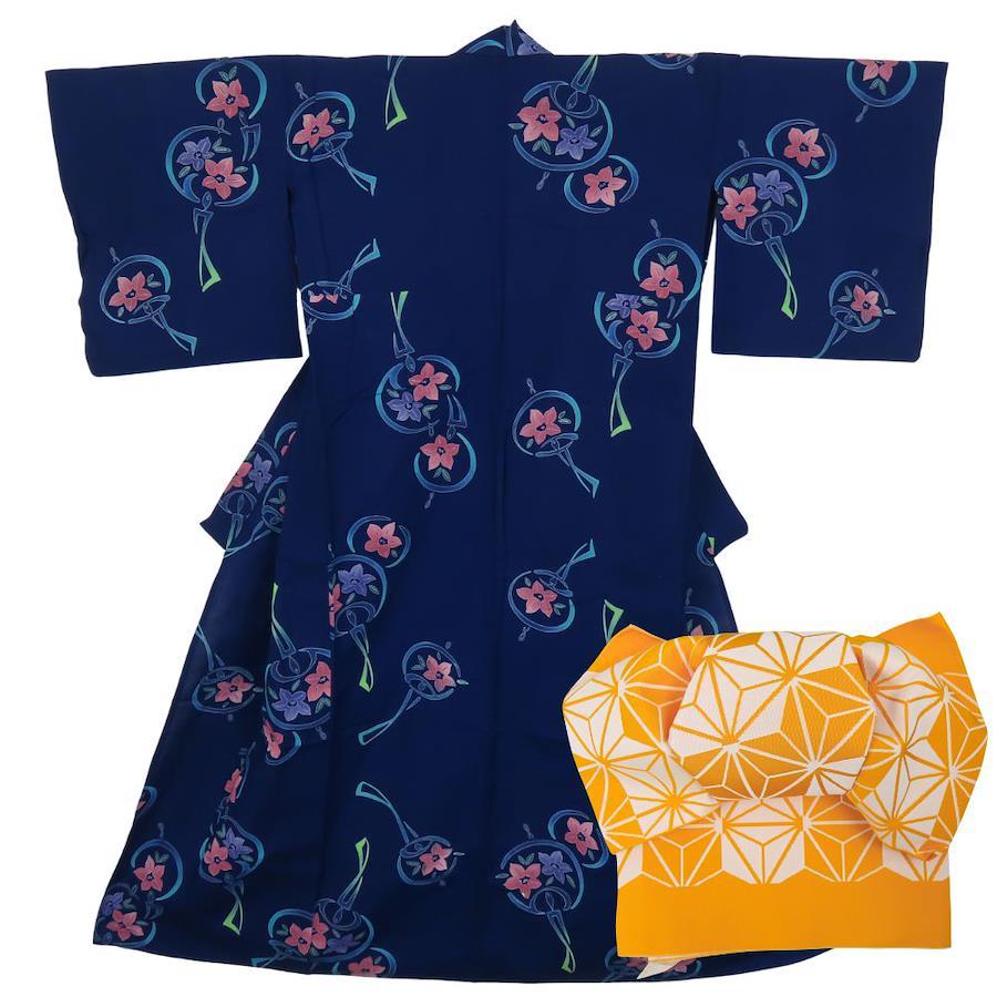 | 品名 | 【中古】 浴衣 2点セット 作り帯 綿 ポリエステル 藍色系 黄色 マルチカラー 注染ゆかた リボン 可愛い レディース 女性 |