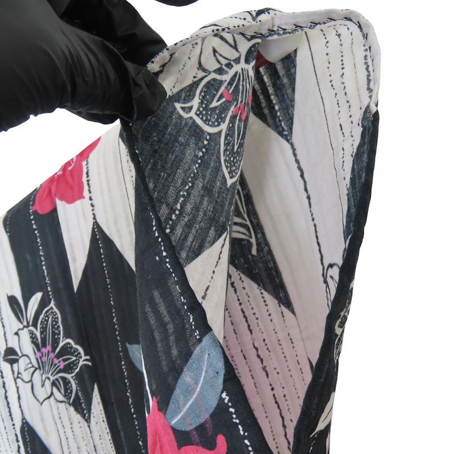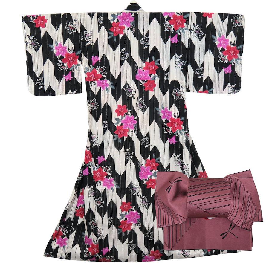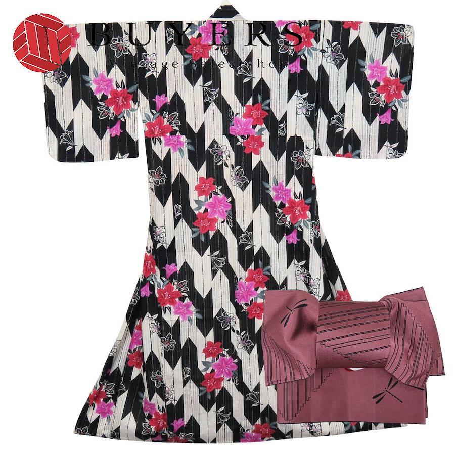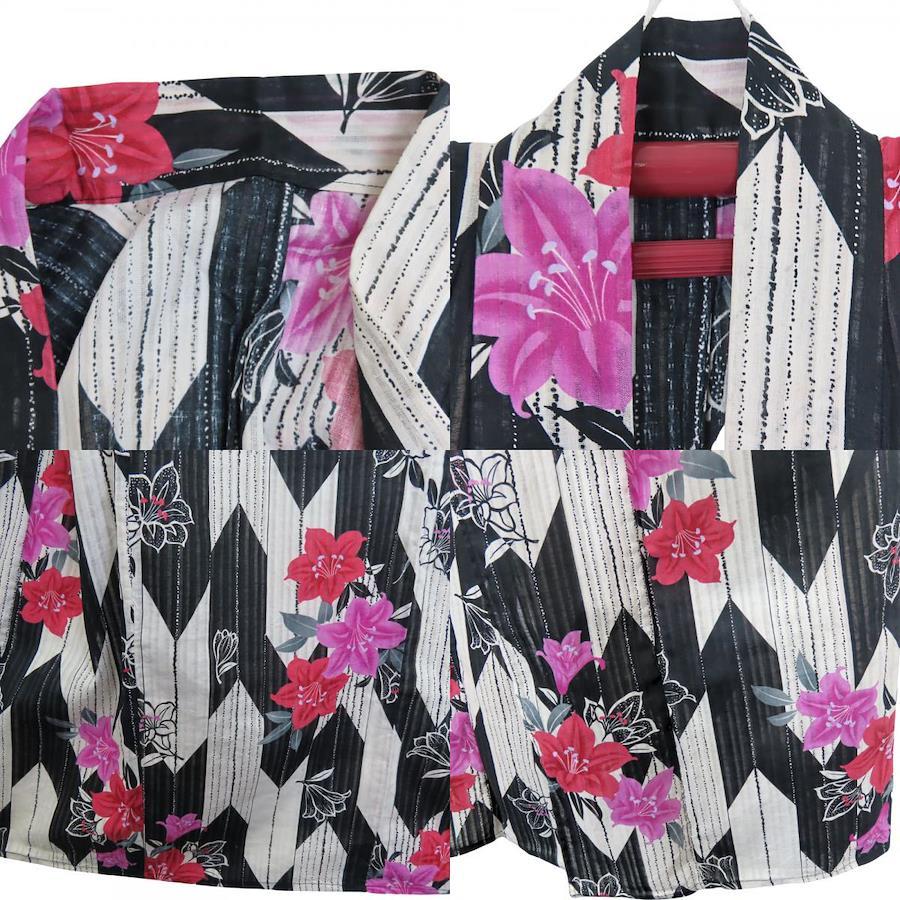 | 品名 | 【中古】 浴衣 2点セット 作り帯 綿 ポリエステル ホワイト ブラック ピンク系 変わり生地 おしゃれ レディース 女性 |