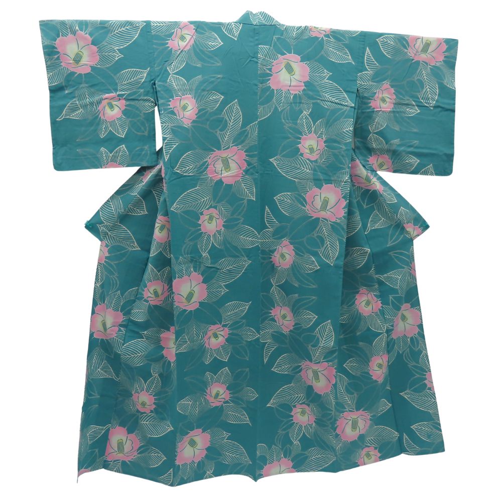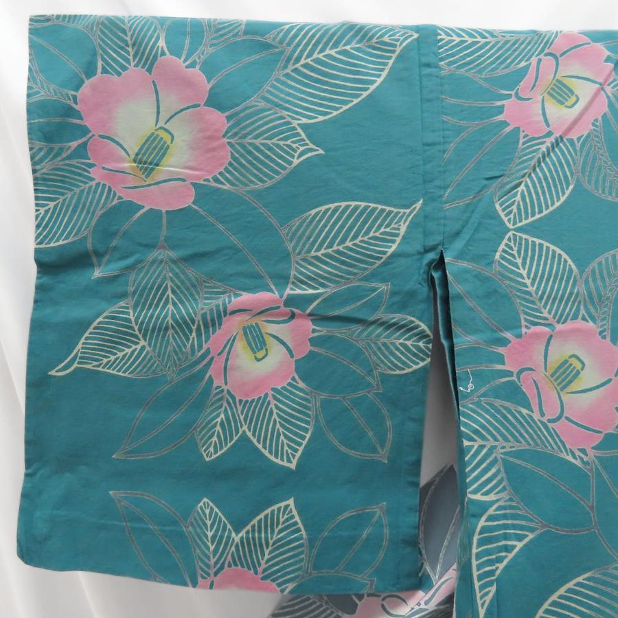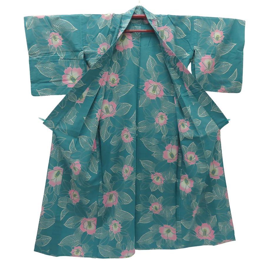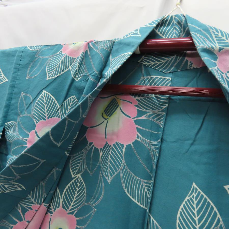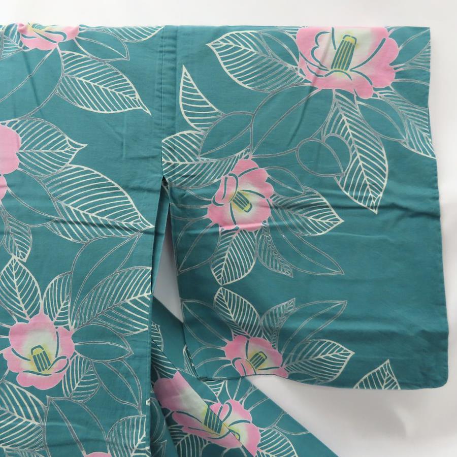 | 品名 | 【中古】 浴衣 綿 青緑系 桃色 灰色 椿柄 お洒落 大人可愛い レディース 女性 |