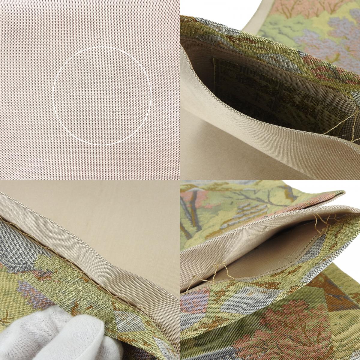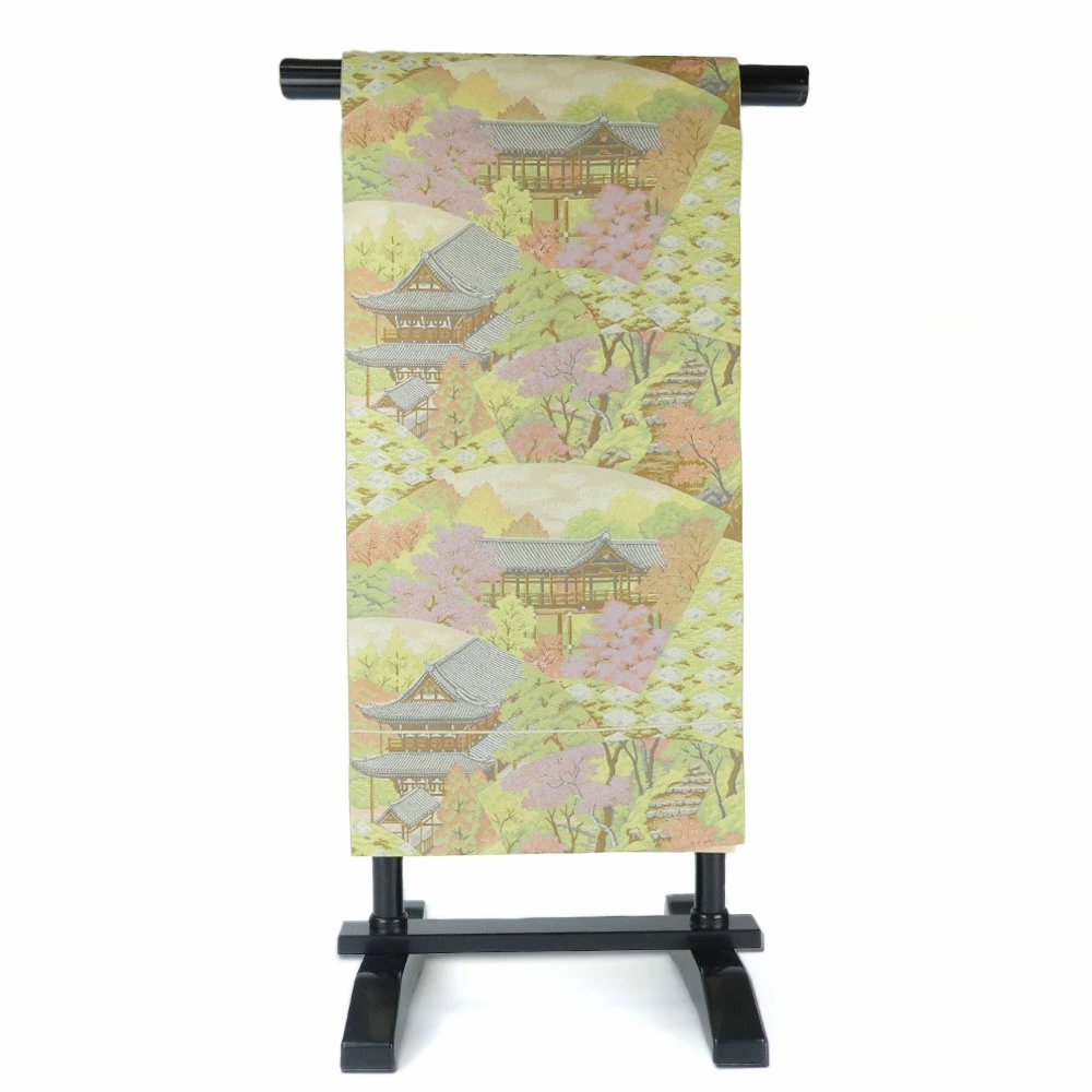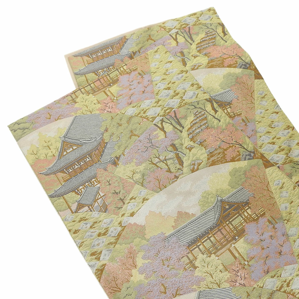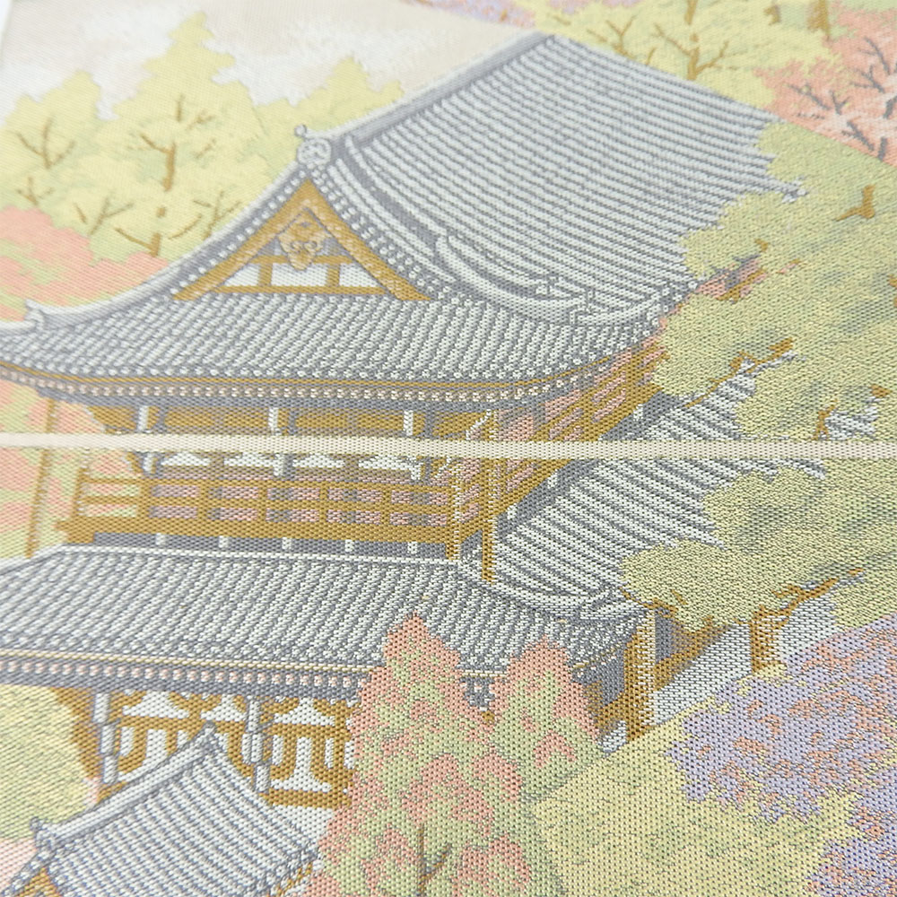 | 品名 | 【中古】袋帯 風景柄 寺院 春 桜 グリーン 薄ピンク パステルカラー フォーマル用 六通柄 正絹 シルク レディース 女性 和装 呉服 着物 |