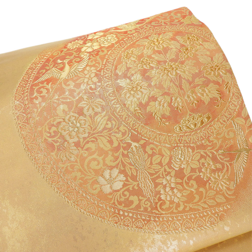 | 品名 | 【中古】袋帯 鏡裏文 金地 ゴールド イエロー オレンジ 引き箔 お太鼓柄 フォーマル用 正絹 シルク 呉服 着物 |