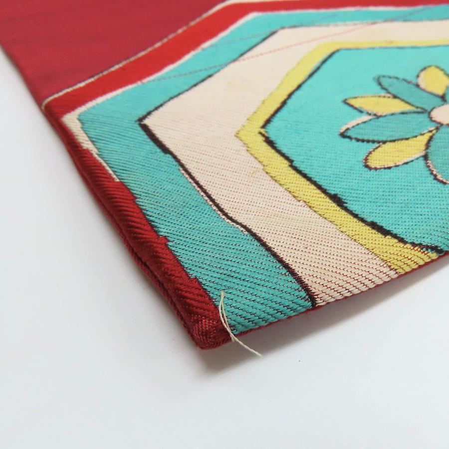 品名【中古】 名古屋帯 九寸 正絹(金銀糸除く) ワインレッド系 ライトブルー イエロー ホワイト 名古屋仕立て お洒落 レディース 女性
