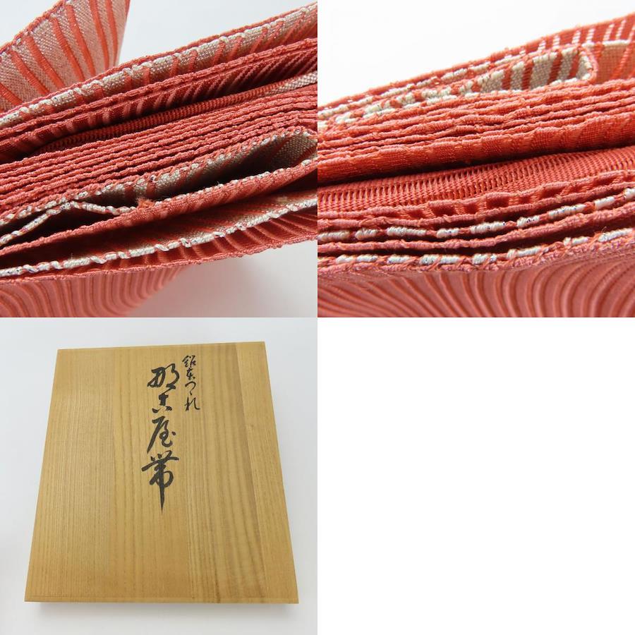| 品名 | 【中古】 名古屋帯 波筬織 絽 正絹(金銀糸除く) 銀糸 ピンク ホワイト シルバー 松葉仕立て 桐箱入り 夏物 レディース 女性 |