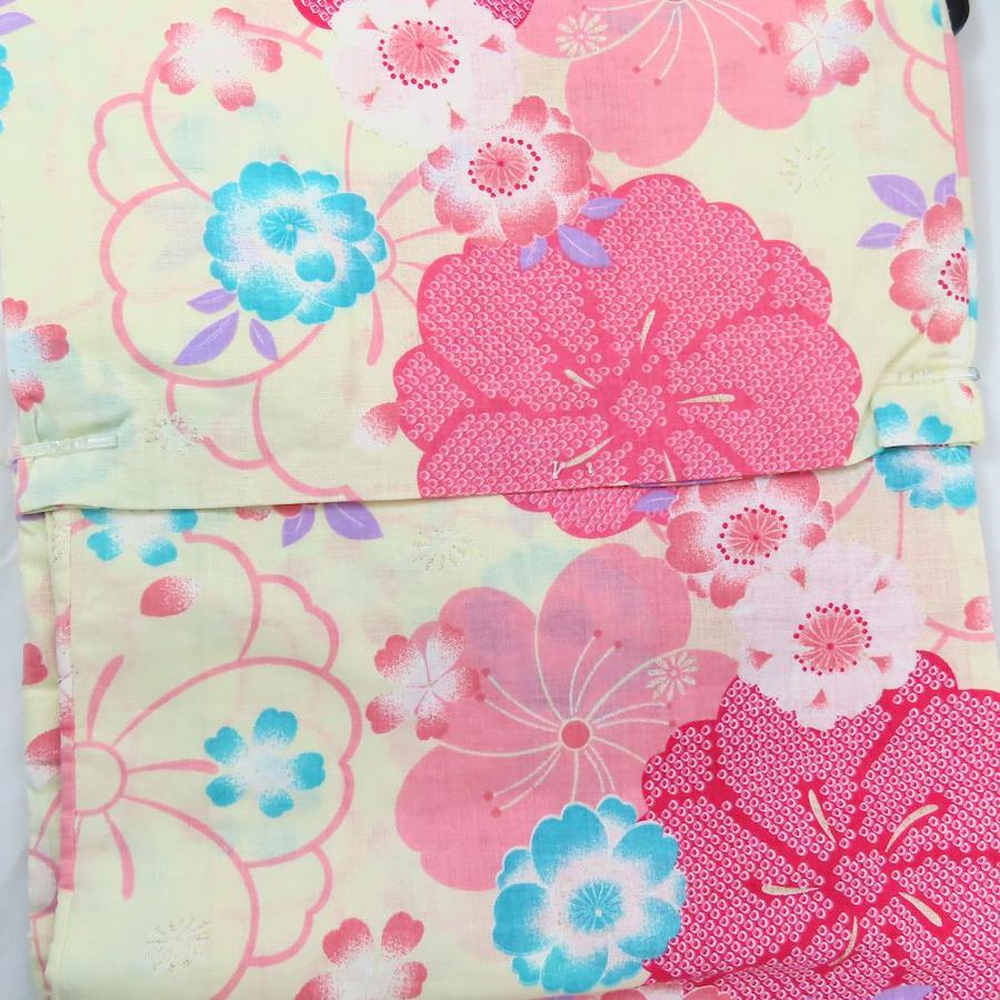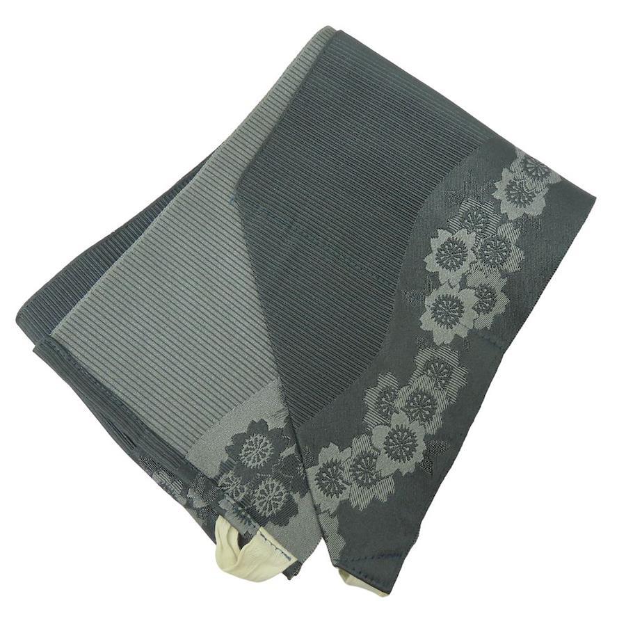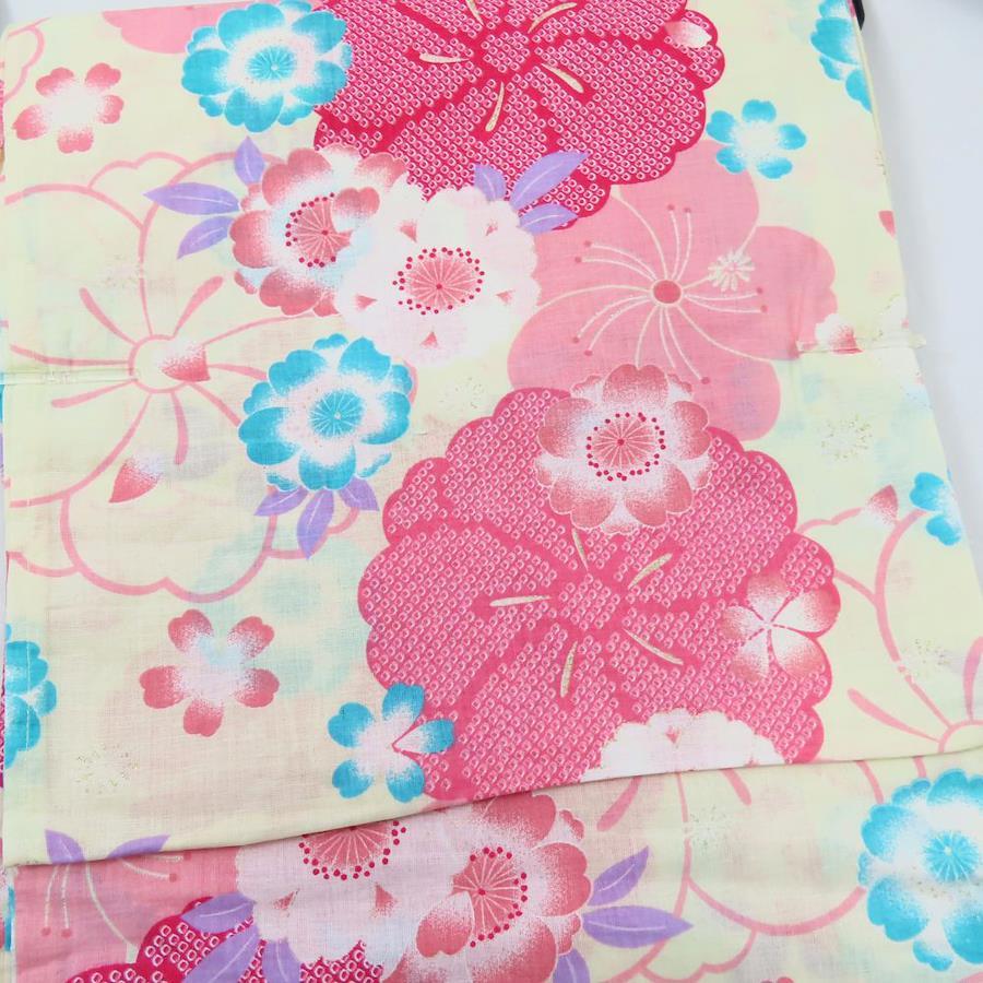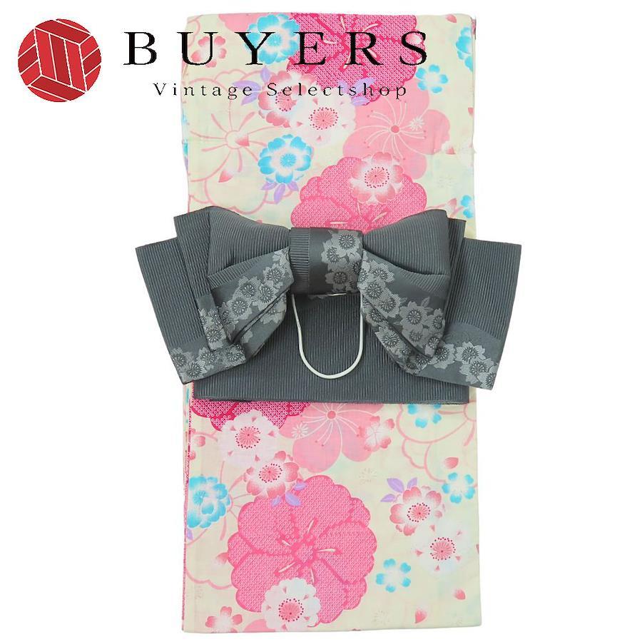 | 品名 | 【中古】 浴衣 セット 作り帯 桜柄 綿 ポリエステル クリーム系 ダークグレー マルチカラー ラメ入り リボン 大人可愛い レディース 女性 |