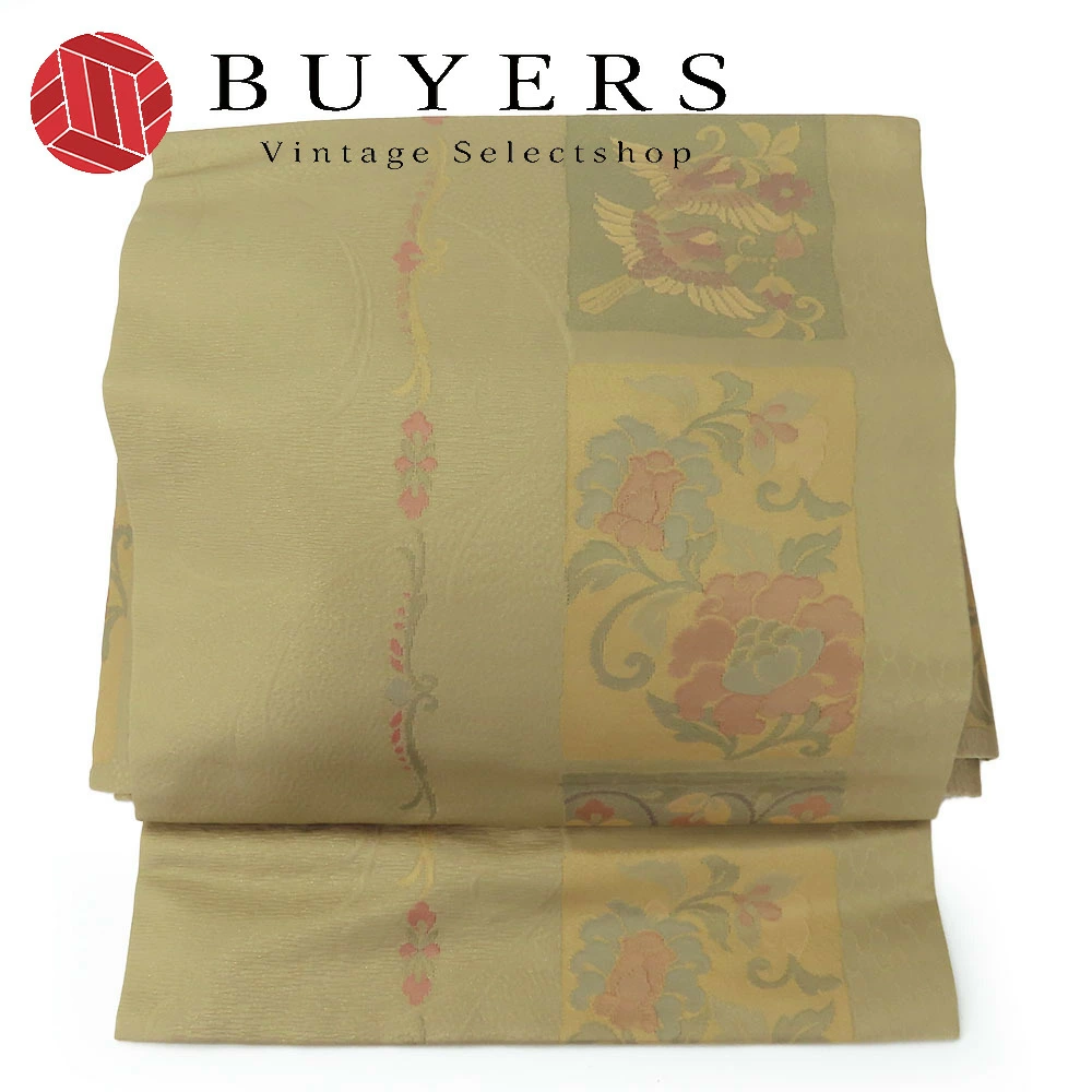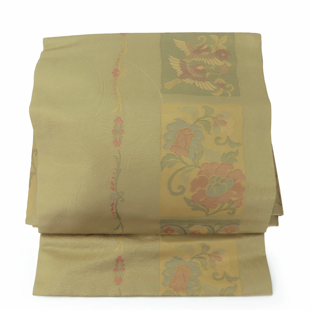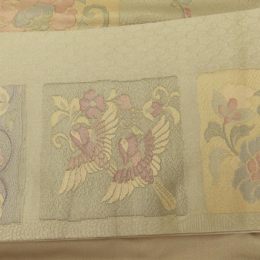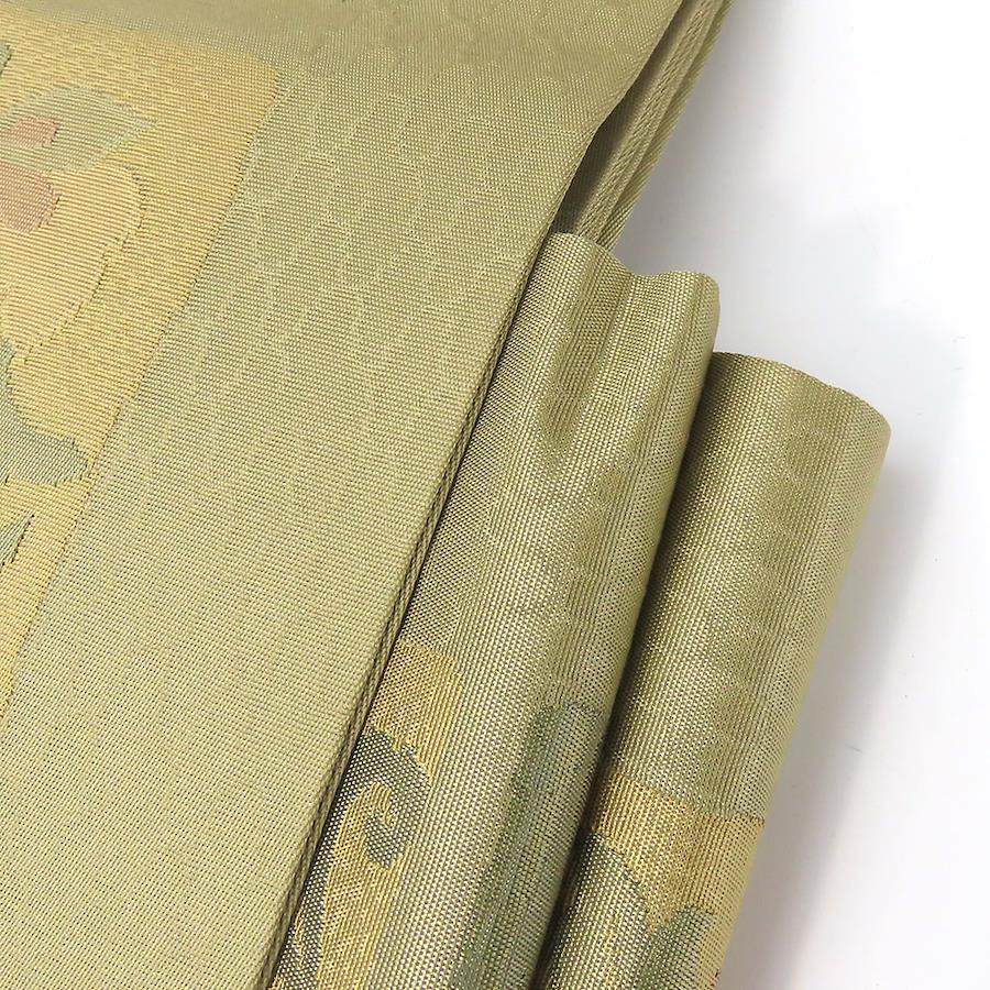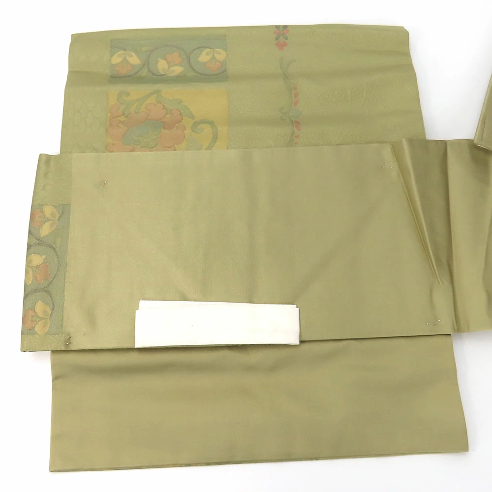品名【中古】 その他帯 文化帯 正絹(金銀糸除く) うぐいす色 くすみ色 マルチカラー 造り帯 お太鼓 モダン レディース 女性
