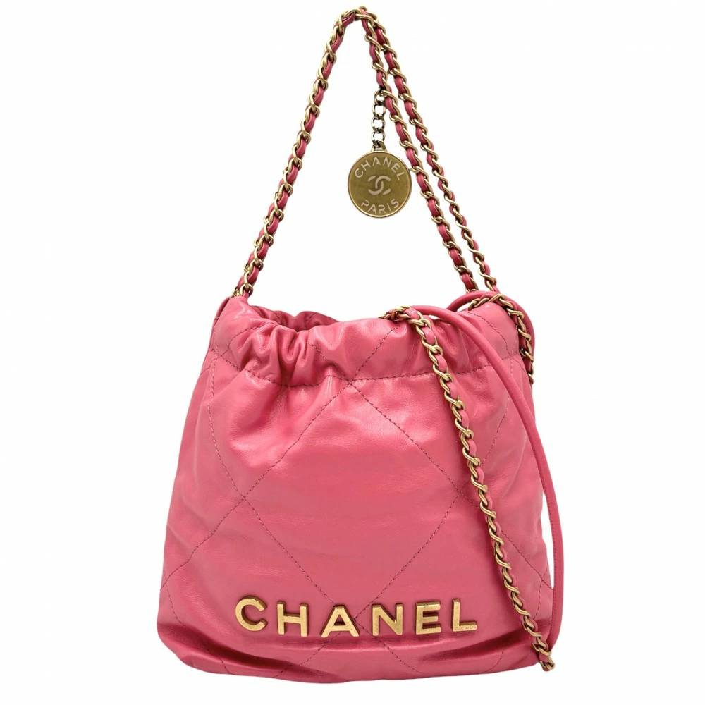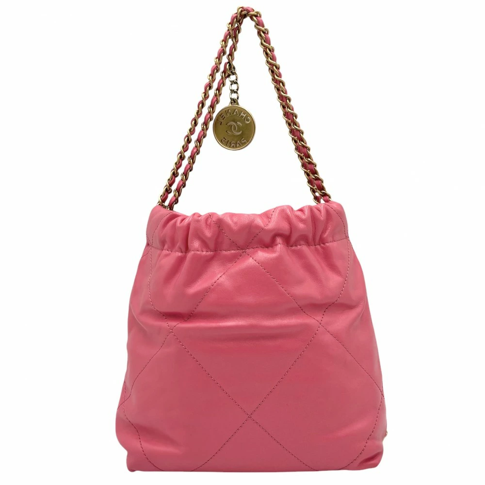 [22% OFF] Pre-owned Chanel 22 Mini Logo Handbag/Shoulder Bag with Chain. Perfect for carrying on the shoulder or across the body. Made of pink leather with gold hardware. Excellent condition.