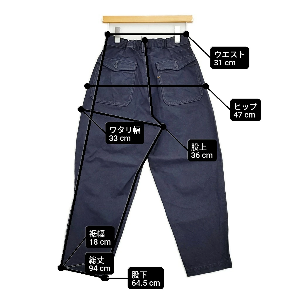 | 実寸サイズ | 総丈:約94cm ウエスト:約31cm ウエスト最長:約37cm 股上:約36cm 股下:約64.5cm ヒップ:約47cm ワタリ幅:約33cm 裾幅:約18cm ※採寸画像がある商品はハンガーに吊るした状態での計測のため、平置きでの採寸とは差が生じる場合がございます。平置きでの実寸サイズをご希望の場合は、ご購入前に必ずご質問ください。 ※記載以外のサイズが合わないことを理由とした返品はできませんので、 記載部分以外で実寸サイズの気になる箇所があれば必ず購入前にご質問ください。 |