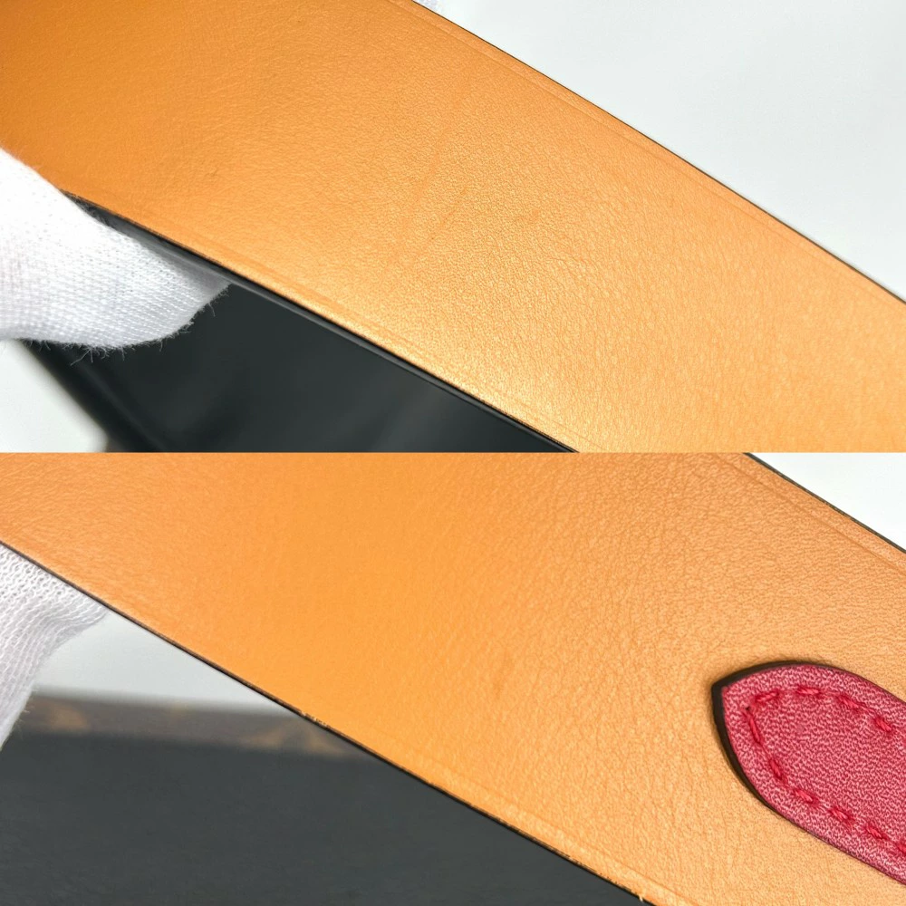 | コメント | ・外側に線傷、スレ、若干型崩れ ・角にスレ ・持ち手に線傷、汚れ ・内側に薄汚れ ・金具に小キズ、くすみ ・底に汚れ、傷、コーティングはがれ ・正面レザー部分にファスナー金具によるヨレ ・持ち手コバ押し跡 |