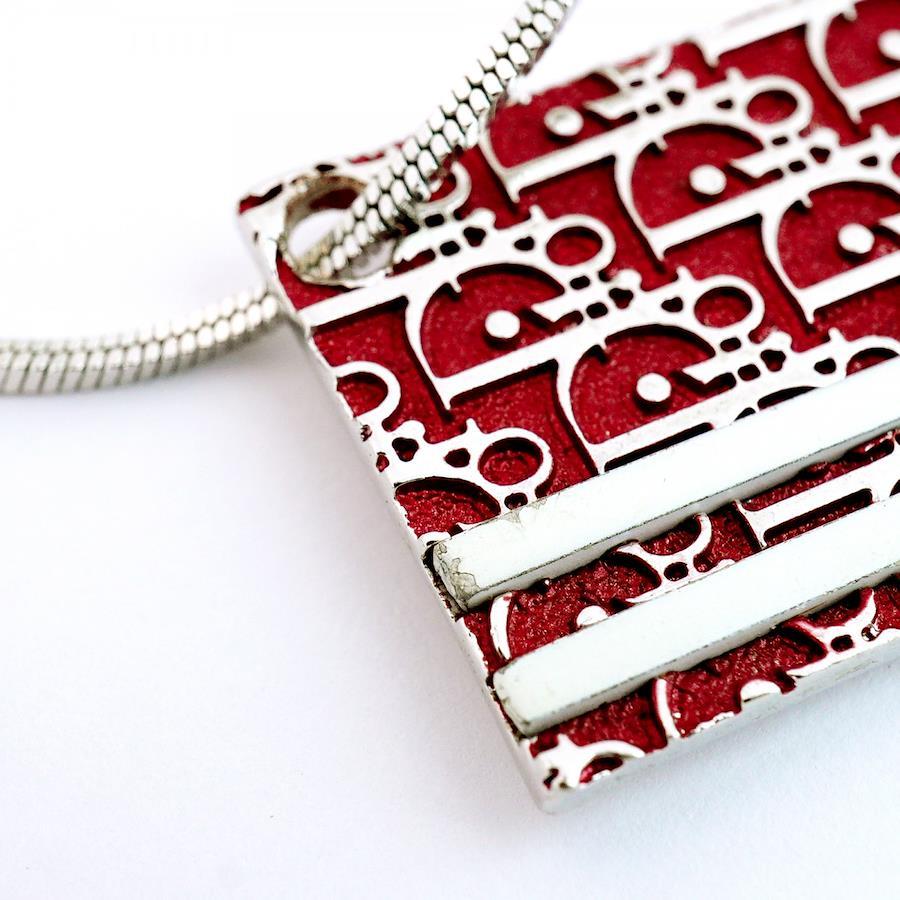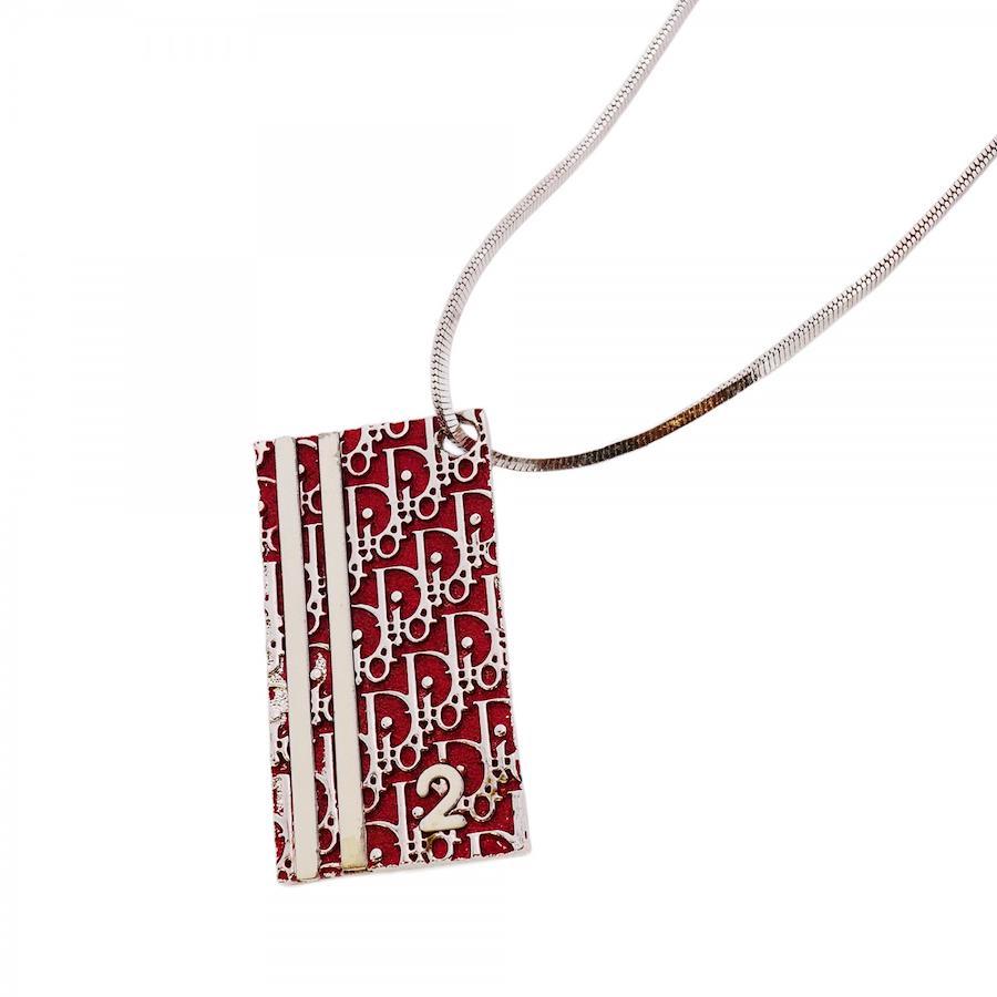 [5jib0322] Christian Dior Trotter Plate Necklace, Metal, Silver and Red [Pre-owned] Men's, Women's, Unisex