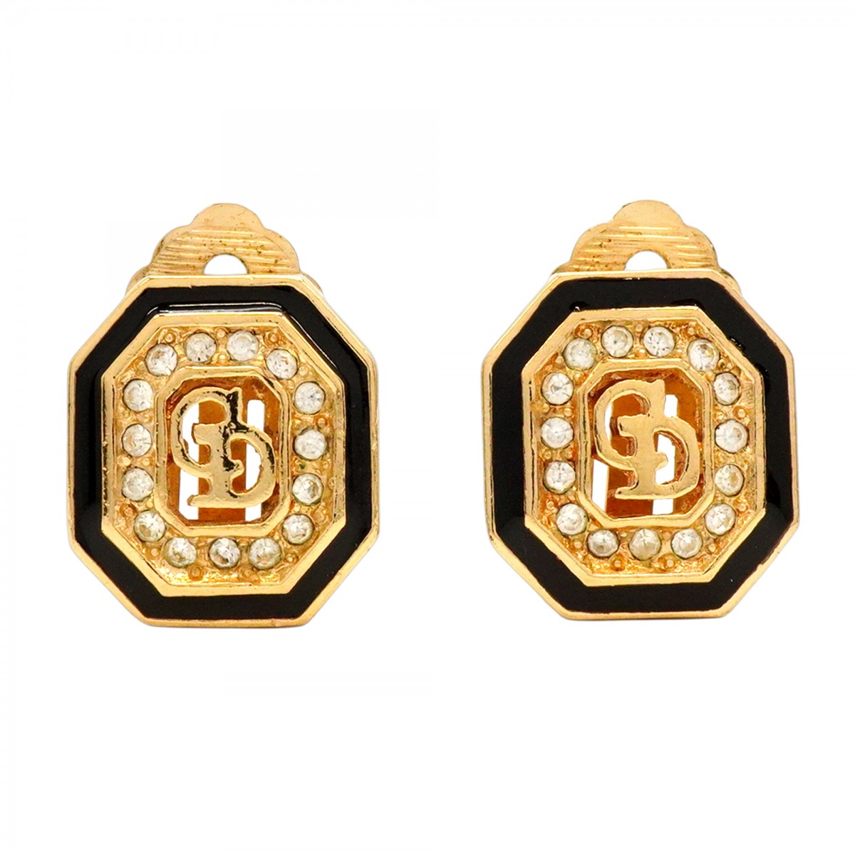 【5jib0341】クリスチャンディオール イヤリング CDロゴ GPメッキ ラインストーン ゴールド ブラック【中古】レディース