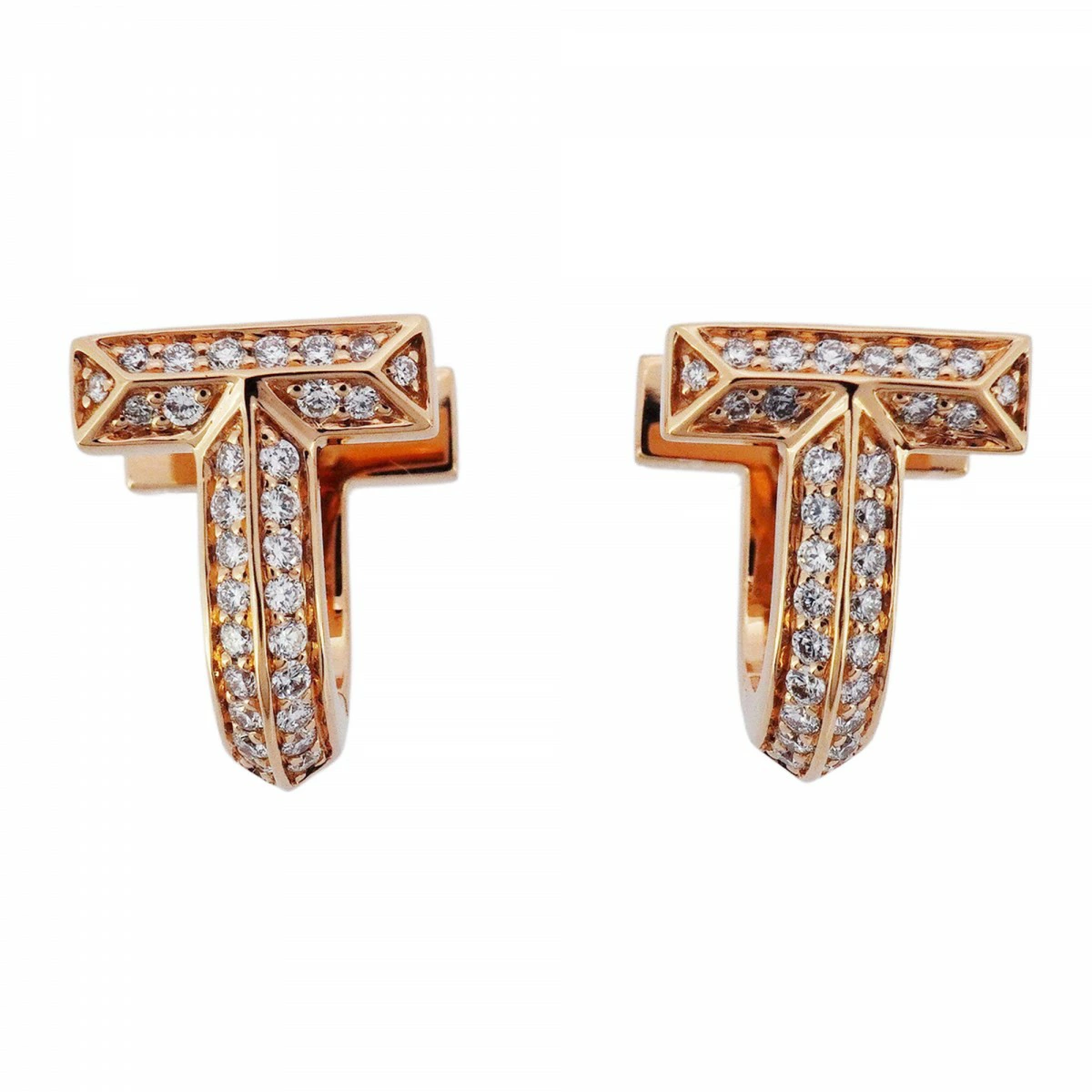 【5jpb0585】ティファニー ピアス Tワン ハギー ハーフパヴェ K18PG ピンクゴールド ダイヤモンド 0.14ct【中古】レディース
