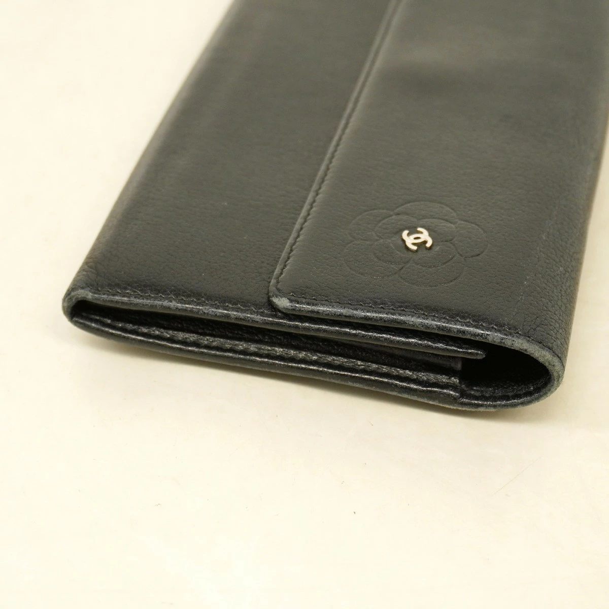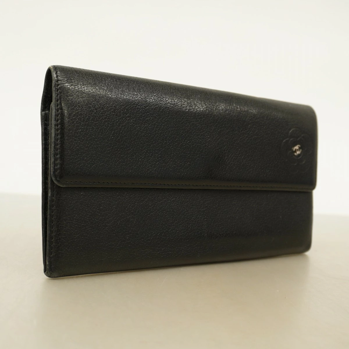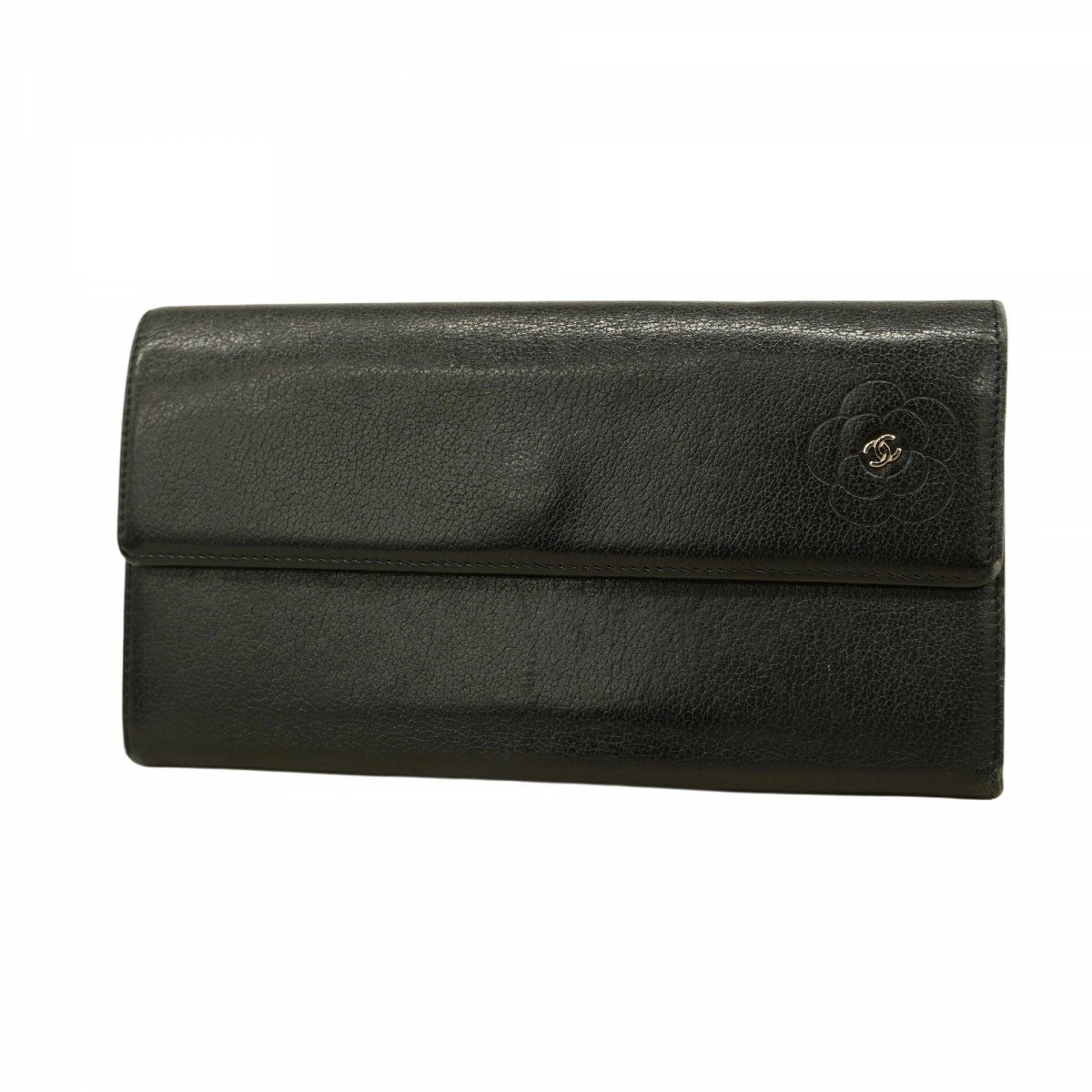 【5od4030】シャネル 長財布 カメリア レザー ブラック シルバー金具【中古】レディース