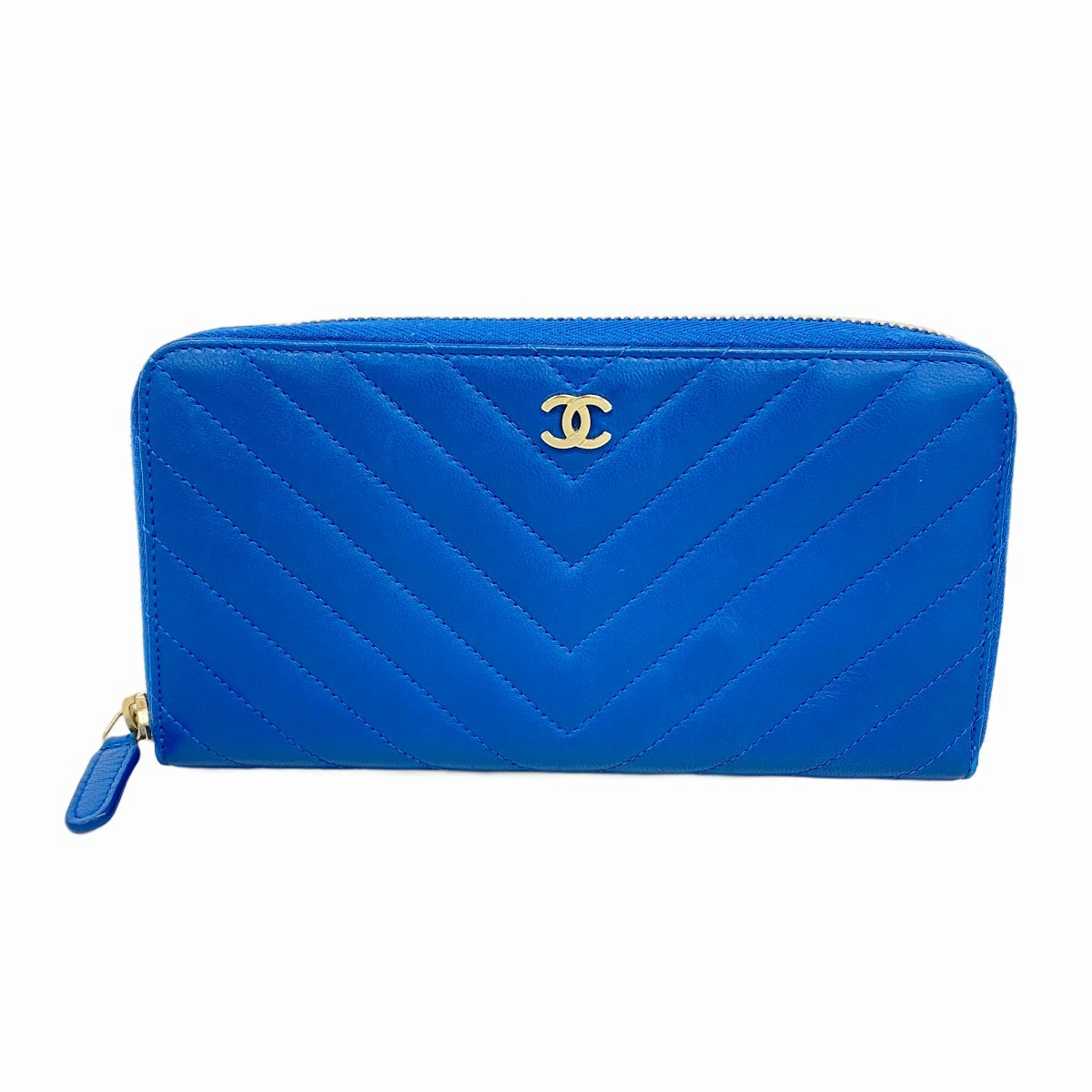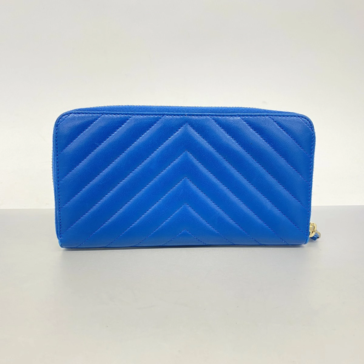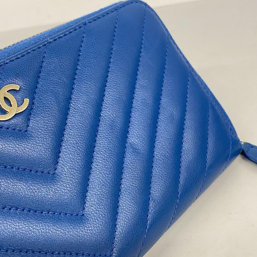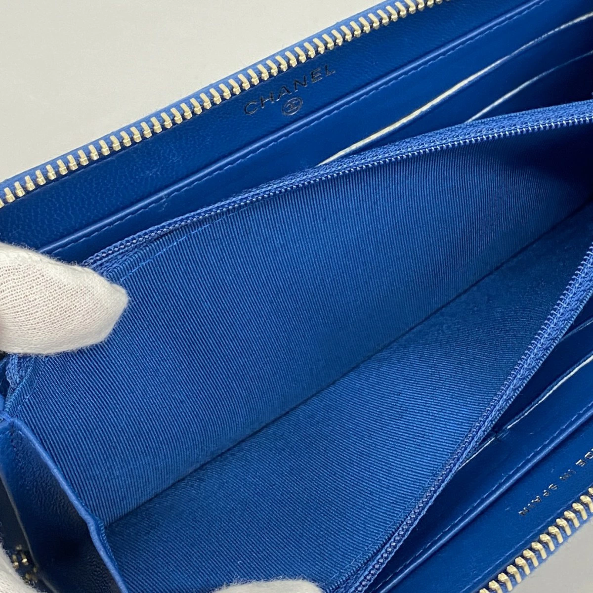 【5pa0273】シャネル 長財布 Vステッチ ラムスキン ブルー シャンパンゴールド金具【中古】レディース