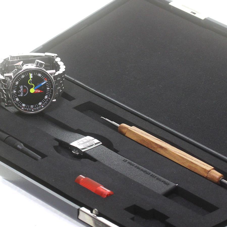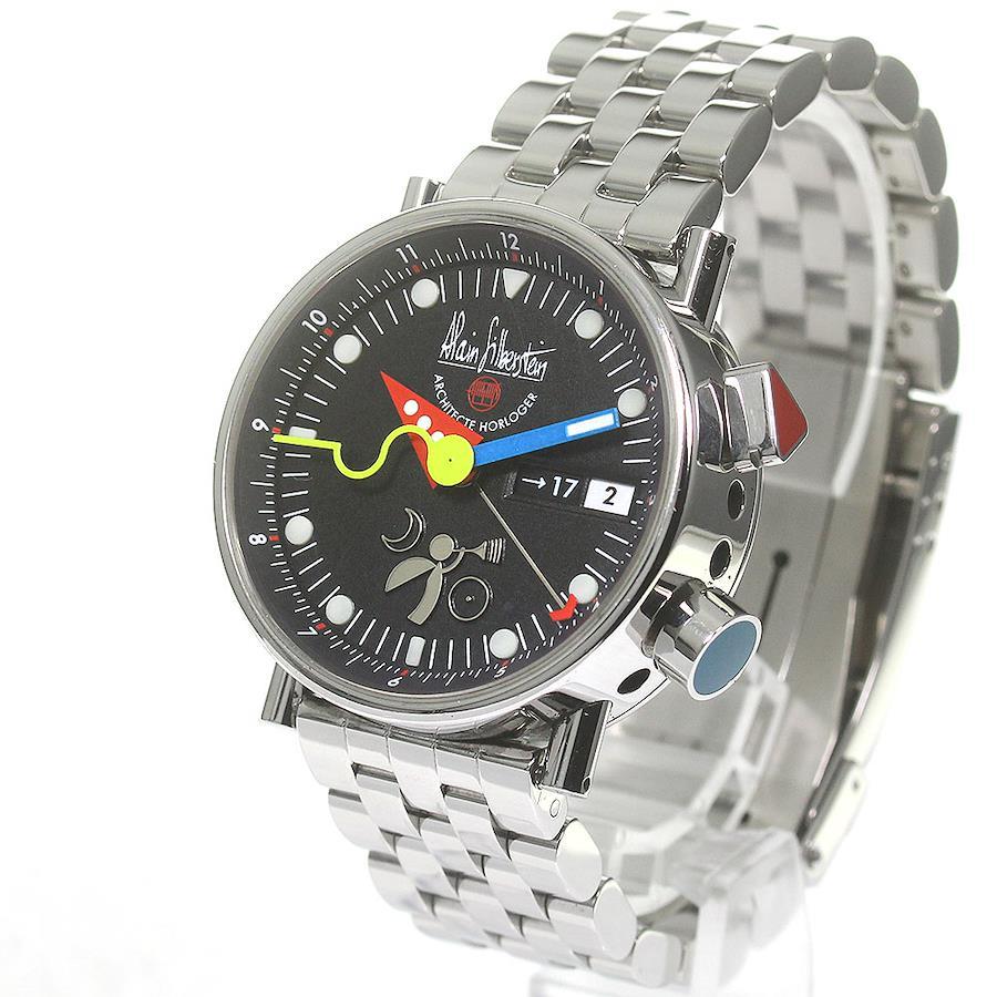 ■商品情報ブランド: アラン・シルベスタイン/Alain Silbersteinモデル名: ル レヴェイユ対象: メンズ素材: SS × SS文字盤色: ブラックムーブメント:自動巻きRef.No: LR21シリアル:1**/500機能・特徴:デイト,GMT,アラーム付属品:内箱,工具,ラバーベルト 余り駒 1コマ (約0.8cm)ケースサイズ(w):約 37mmベルトサイズ:約 16.5 + 0.8cm※ベルトサイズとは、ケース部分も含めた総腕回りのサイズになります。ラグ幅: 19mm日差: +31秒/日 ※参考値OH歴: 弊社では実施しておりません。