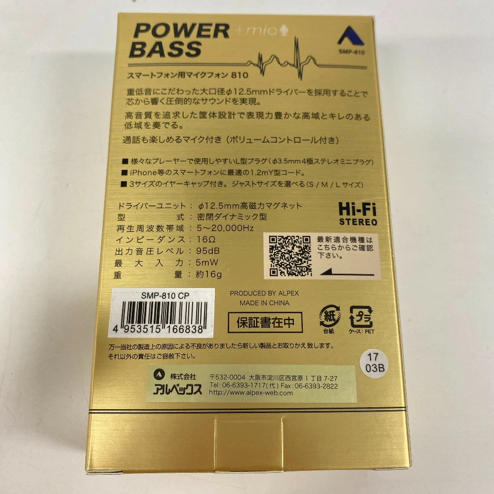 | 商品名 | ALPEX POWER BASS マイク付き SMP-810 有線イヤホン ブラックゴールド |