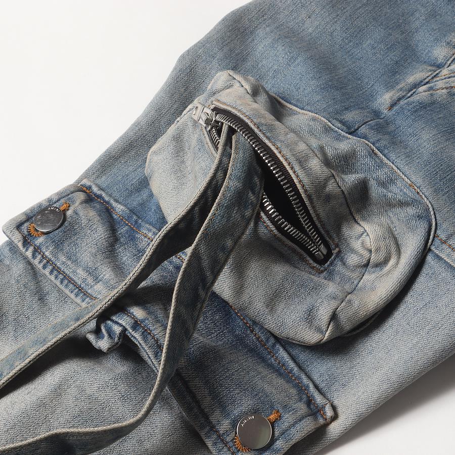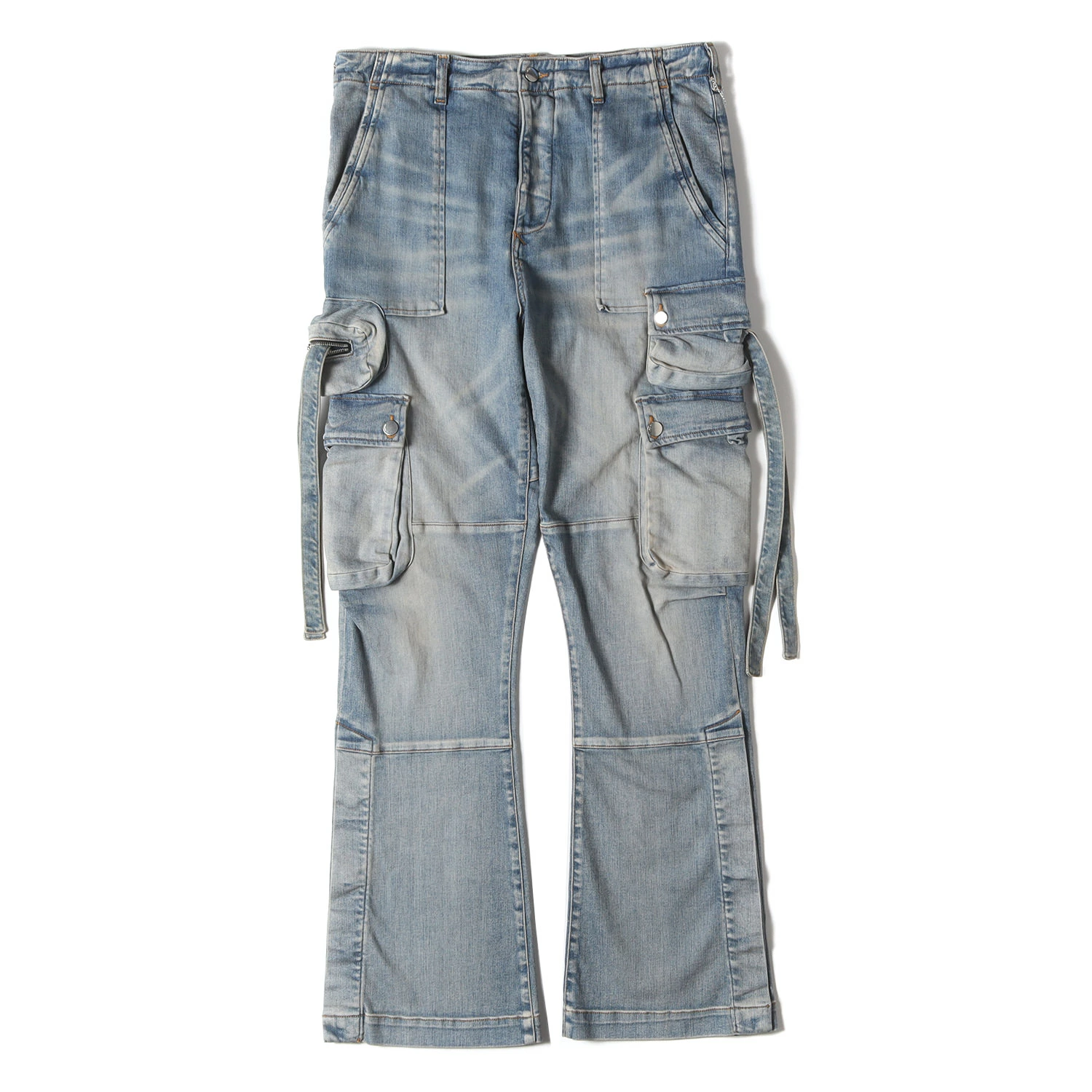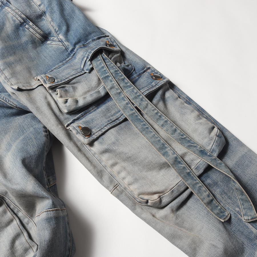 | 商品説明 | ストレッチコットン生地を使用し、ボタンフライで仕上げたカーゴポケットフレアデニムパンツです。全体に泥を利用したヴィンテージウォッシュ加工を施しています。 |