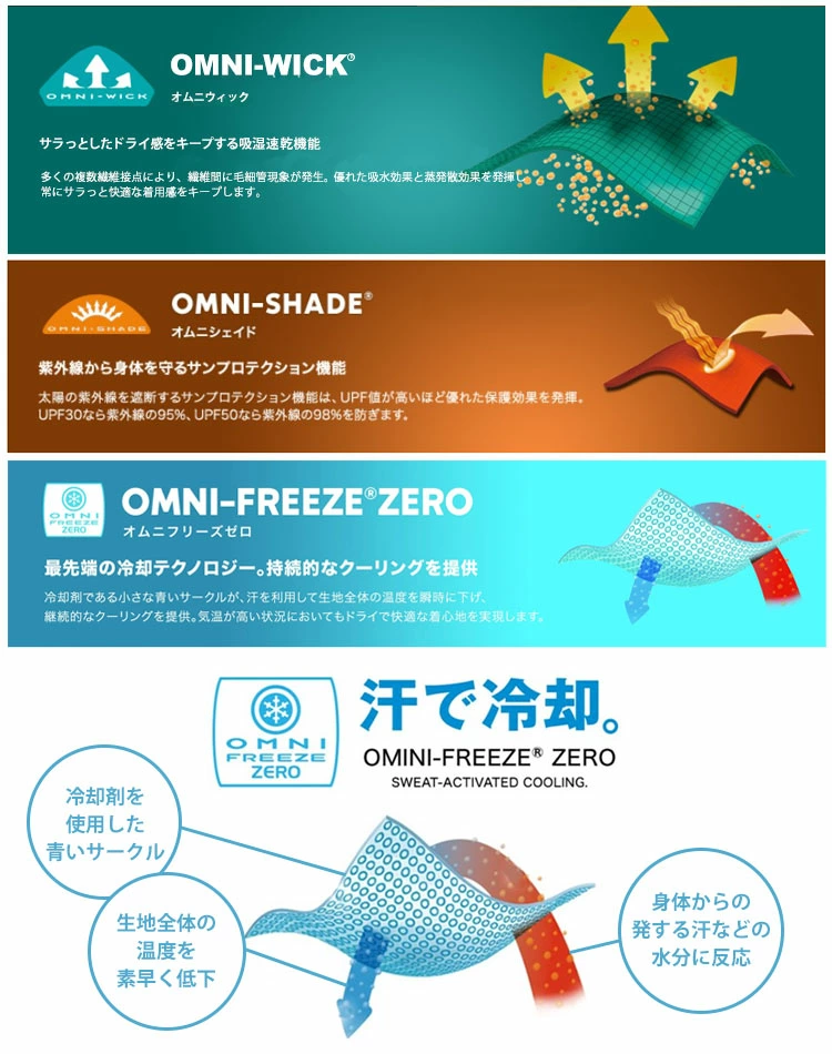【アームスリーブ】真夏でもひんやり感と快適性を持続し、日差しから肌を守るアームカバー。紫外線を98%ブロックする「オムニシェイド UPF50」、汗を利用して温度を下げる「オムニフリーズゼロ」、汗を素早く吸収し乾かす吸汗速乾素材「オムニウィック」を私用しています。(コロンビア独自のテクノロジー)スマートフォンや音楽プレーヤー、キーなどを入れられるメッシュポケットが付いています。快適な機能が豊富に付いているので、ランニングや炎天下での作業にピッタリ◎