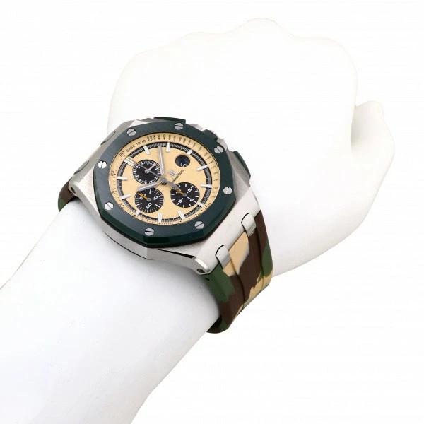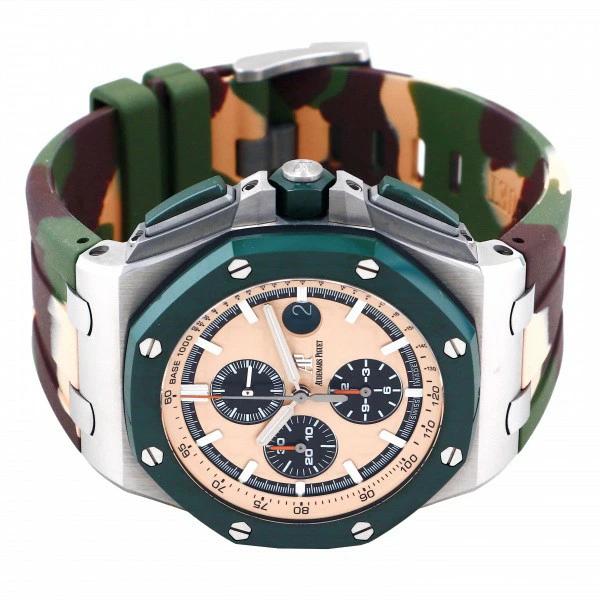 お問い合わせ商品IDW197036ブランドオーデマ・ピゲ商品名オーデマ・ピゲ AUDEMARS PIGUET ロイヤルオーク オフショア クロノグラフ 26400SO.OO.A054CA.01 ベージュ/ブラウン文字盤 未使用 腕時計 メンズ型番26400SO.OO.A054CA.01文字盤色ベージュ/ブラウン文字盤種メガ・タペストリー素材ステンレスセラミックラバーサイズケースサイズ: 44.0mmムーブメント自動巻き機能クロノグラフデイト表示防水100m防水当店保証ご購入日より2年付属品国際保証書(ギャランティー) 有り純正ボックス 有り商品状態[ 未使用品 ]店頭展示品。※詳細はお問い合わせください。商品説明1875年の誕生以来最も歴史の長い時計メーカーである“オーデマ・ピゲ”。2018年に発売された“ロイヤルオーク・オフショア・クロノグラフ”。グリーンセラミックとカモフラージュ柄のラバーストラップが印象的なオフショア。モデルチェンジにより44mmの存在感あるステンレスケースは強固な一本になっています。ベゼルとリューズ、プッシュボタンは丈夫なセラミックを使用しております。パワーリザーブ50時間を備えた自社製自動巻きムーブメント・キャリバー3126/3840を搭載しています。ご注文・ご来店前にご確認くださいませご来店購入をご希望の場合は、ご来店前に在庫の確認をお願いいたします。当サイトの商品は、実店舗でも販売しておりますので、あらかじめ在庫のご確認をお願いいたします。売り切れの際はご注文をキャンセルさせていただきます事ご容赦くださいませ。流通事情などにより付属品の一部がご提供できない場合がございます。商品によってはマイナーチェンジなどにより、掲載画像と現物に差異がみられることがございます。ご使用のパソコン環境により、掲載画像と現物の色合いに若干差異がみられることがございます。予告なく価格が改定される場合がございます。返品について通信販売にてご購入いただきました商品は、品質・梱包に万全を期しておりますが、万が一ご到着時に破損・不具合がございましたら2日以内にご連絡をお願いいたします。未使用の場合に限りご返金させていただきます。なお、上記以外の理由やお客様都合、ご使用済みの商品のご返品はお受けいたしかねます。