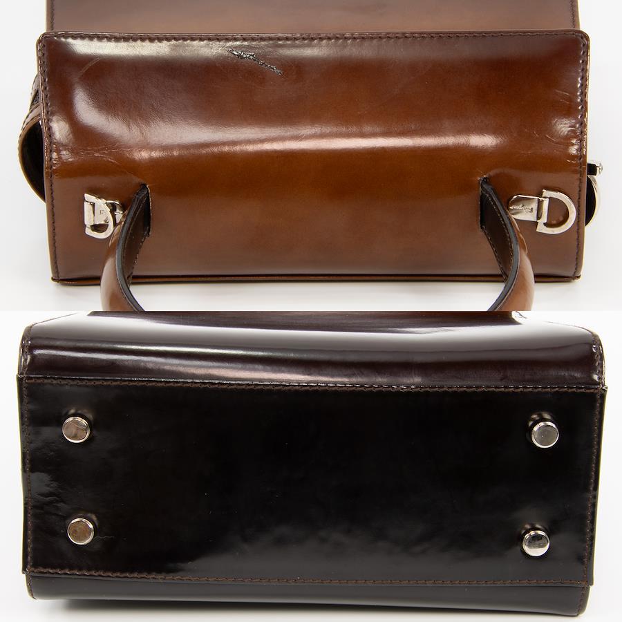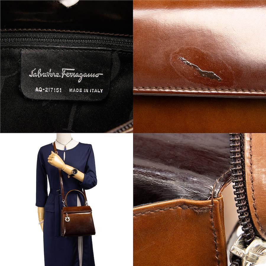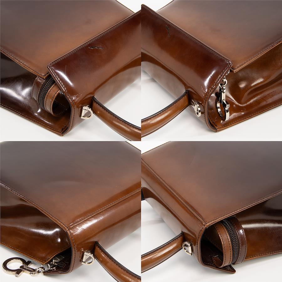 フラップの両端の傷(中)、パテントレザーのくずみ(中)、薄汚れ(小)、使用感(中)