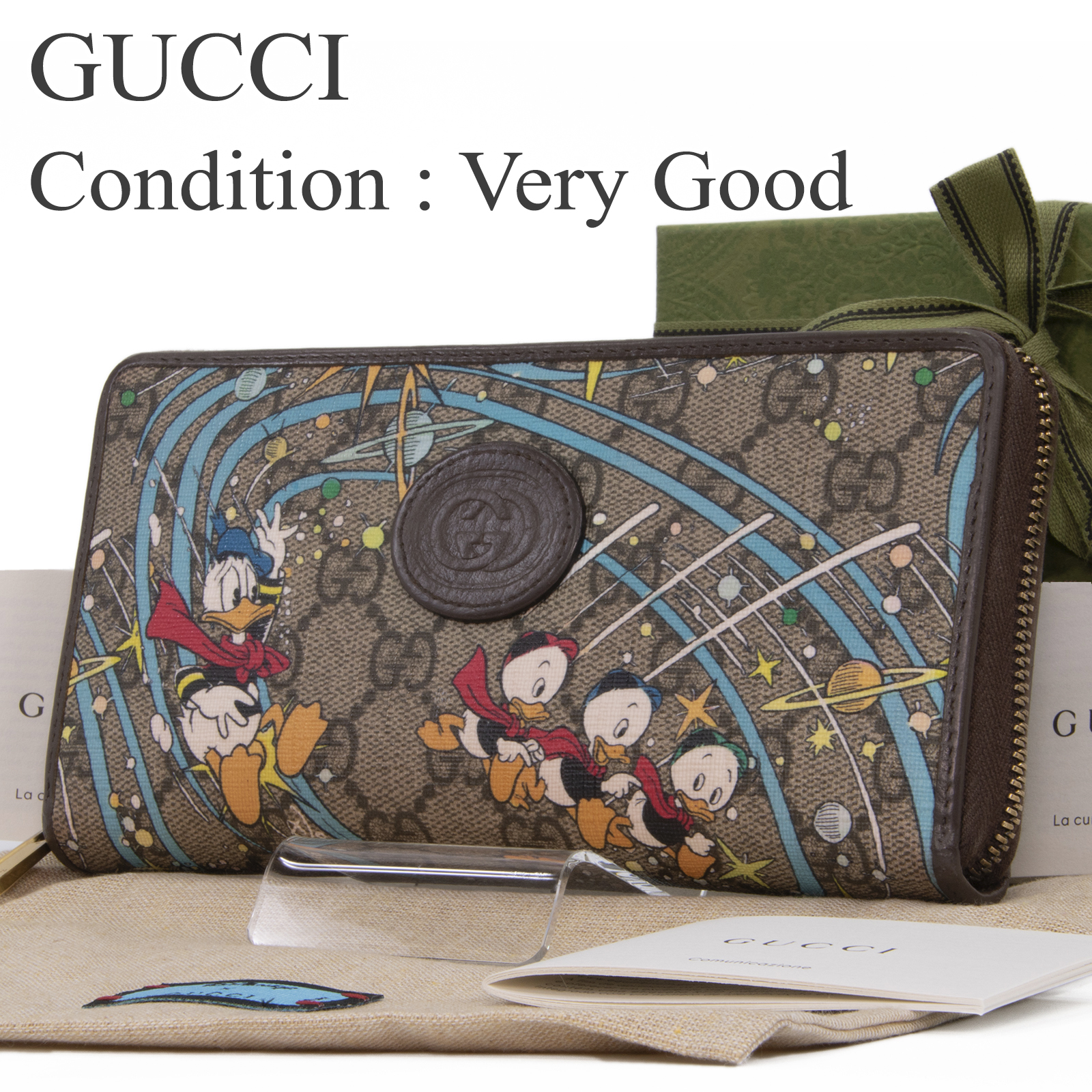 グッチのエピローグコレクションから登場した限定モデルで、陽気なドナルドダックと愛らしい三つ子たちが、星々とともに描かれております。