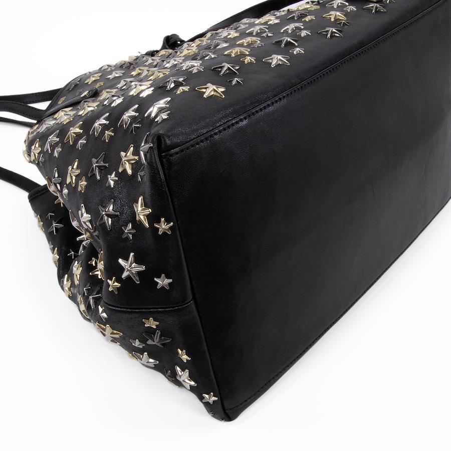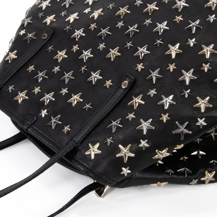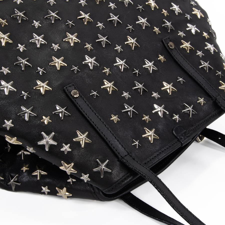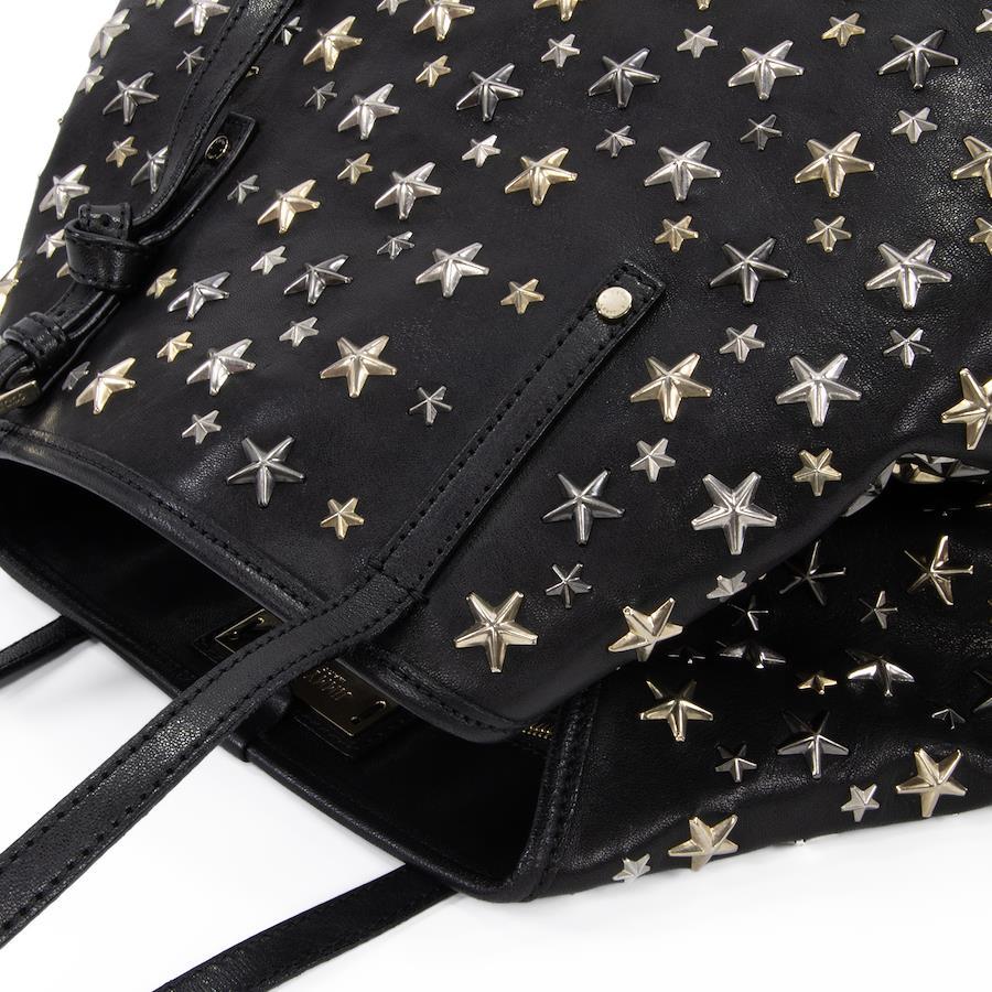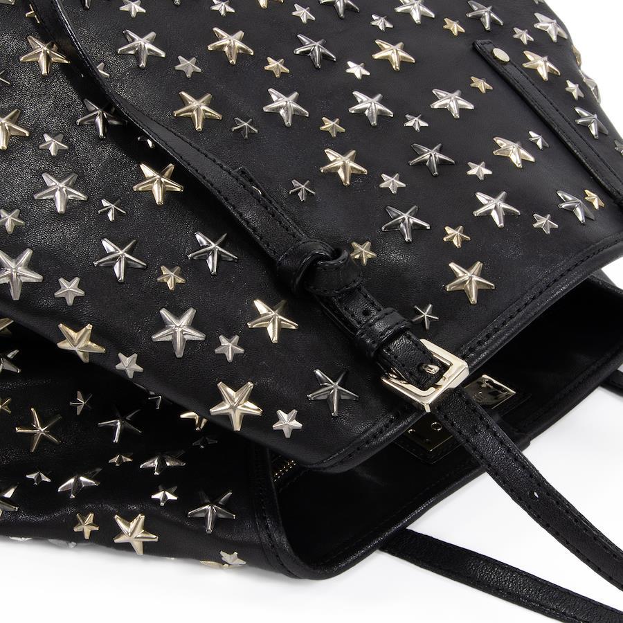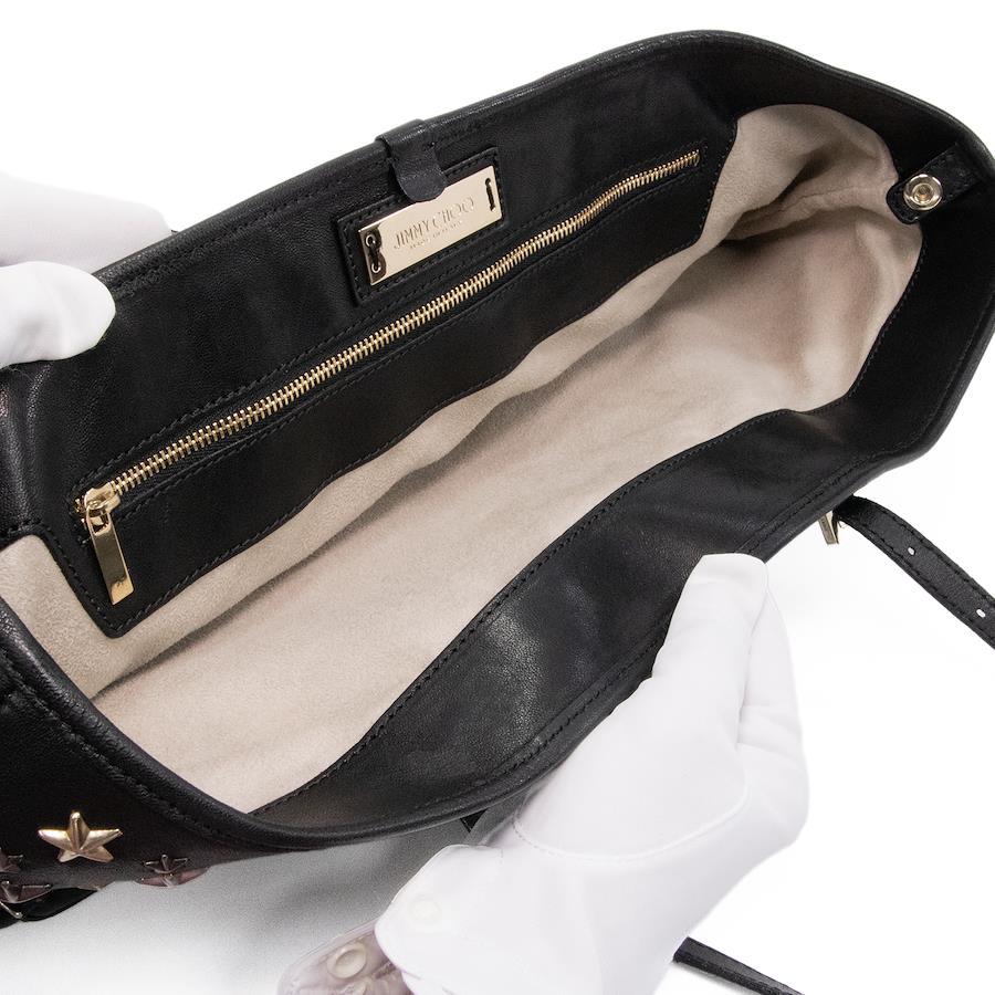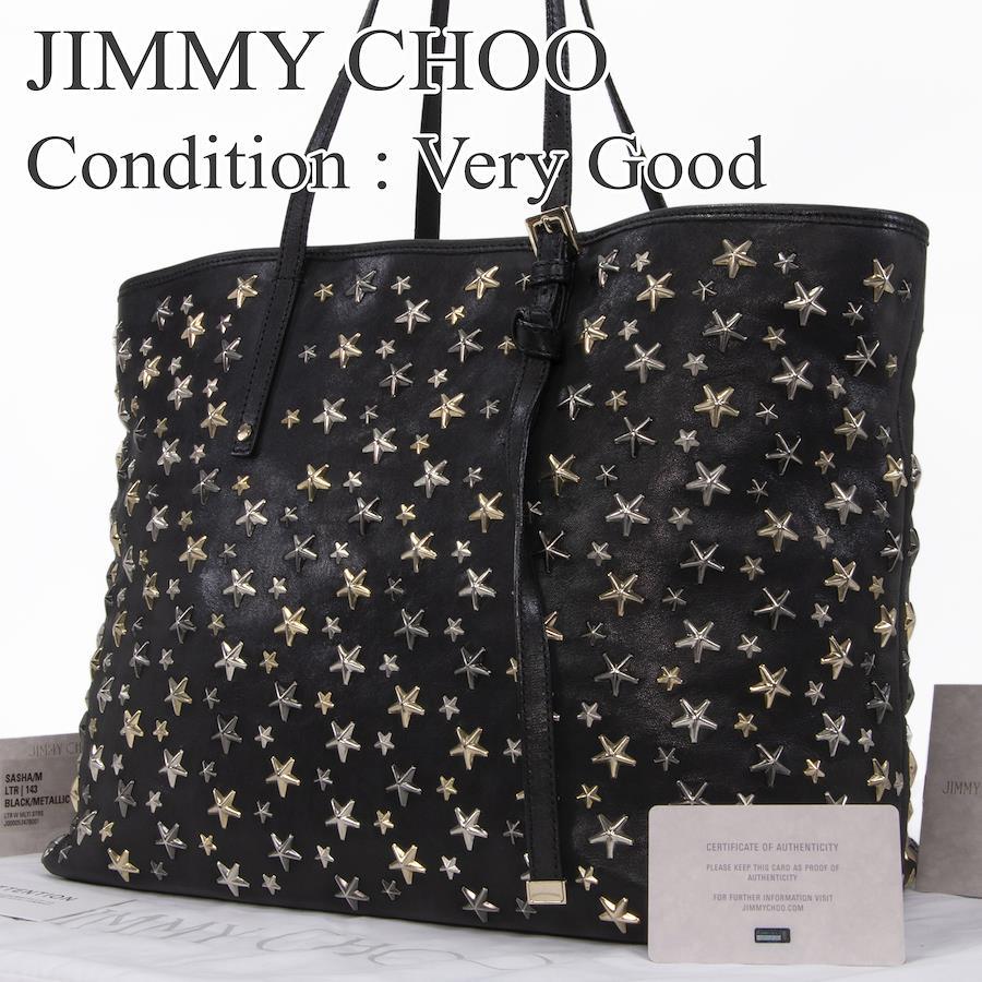 Authentic JIMMY CHOO Sasha M sheepskin handbag/tote/semi-shoulder bag for women, metallic mix black, rare model from the 2000s. A4-compatible, shoulder bag with a star design, tri-color star studs, and a logo. Beautiful, high-end, stylish bag, model E433.