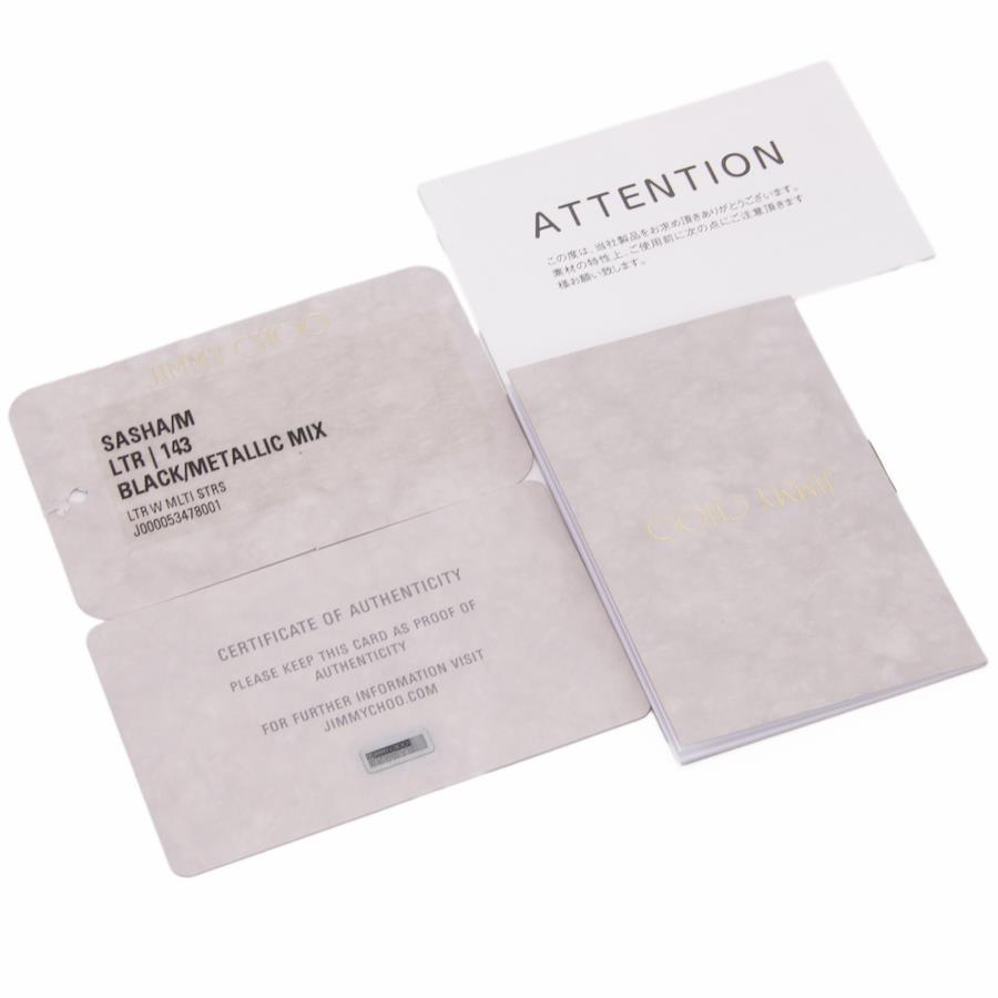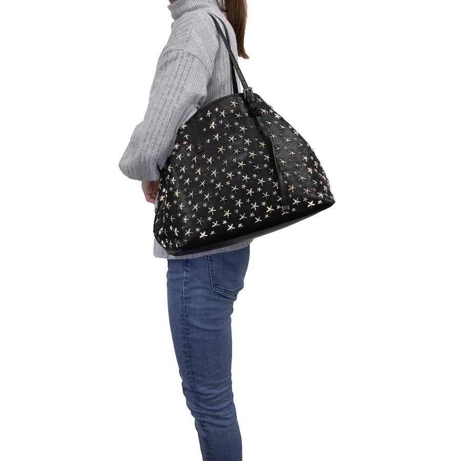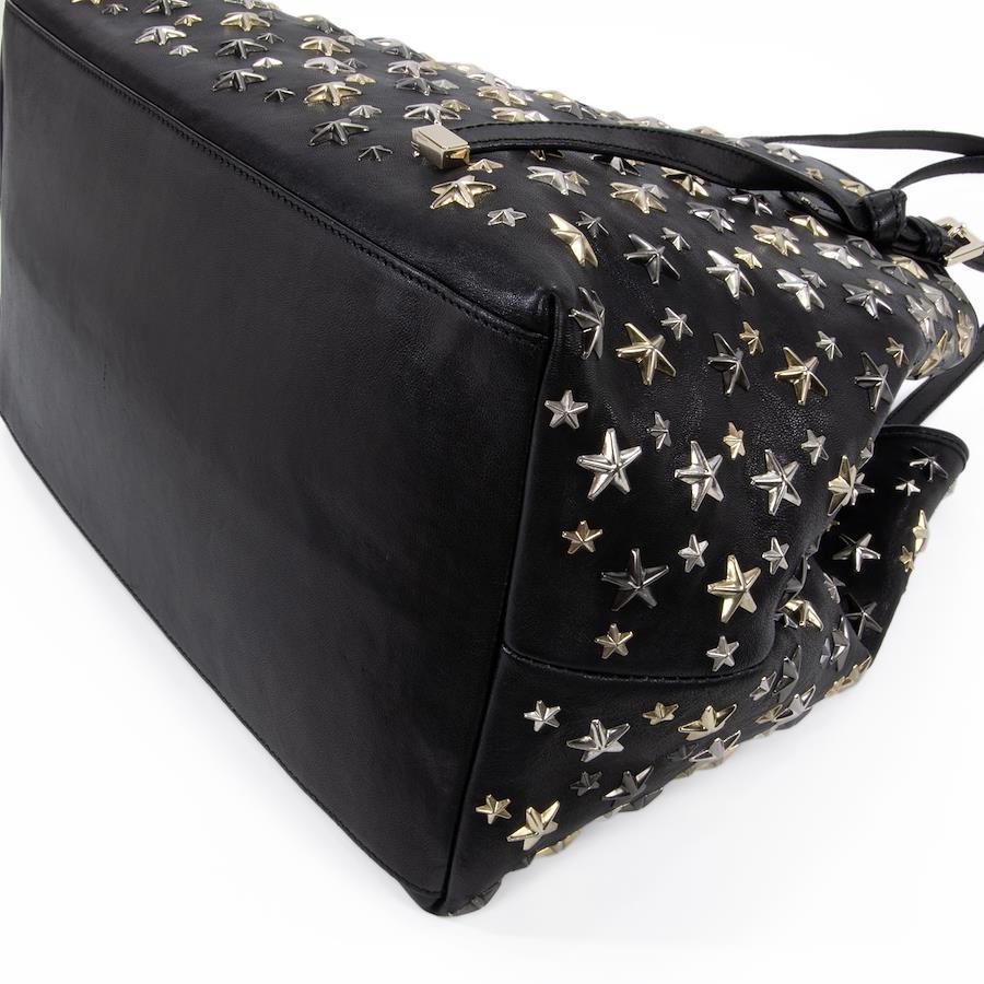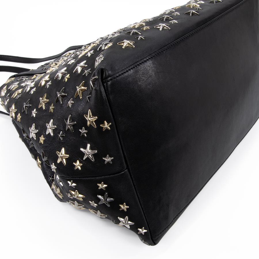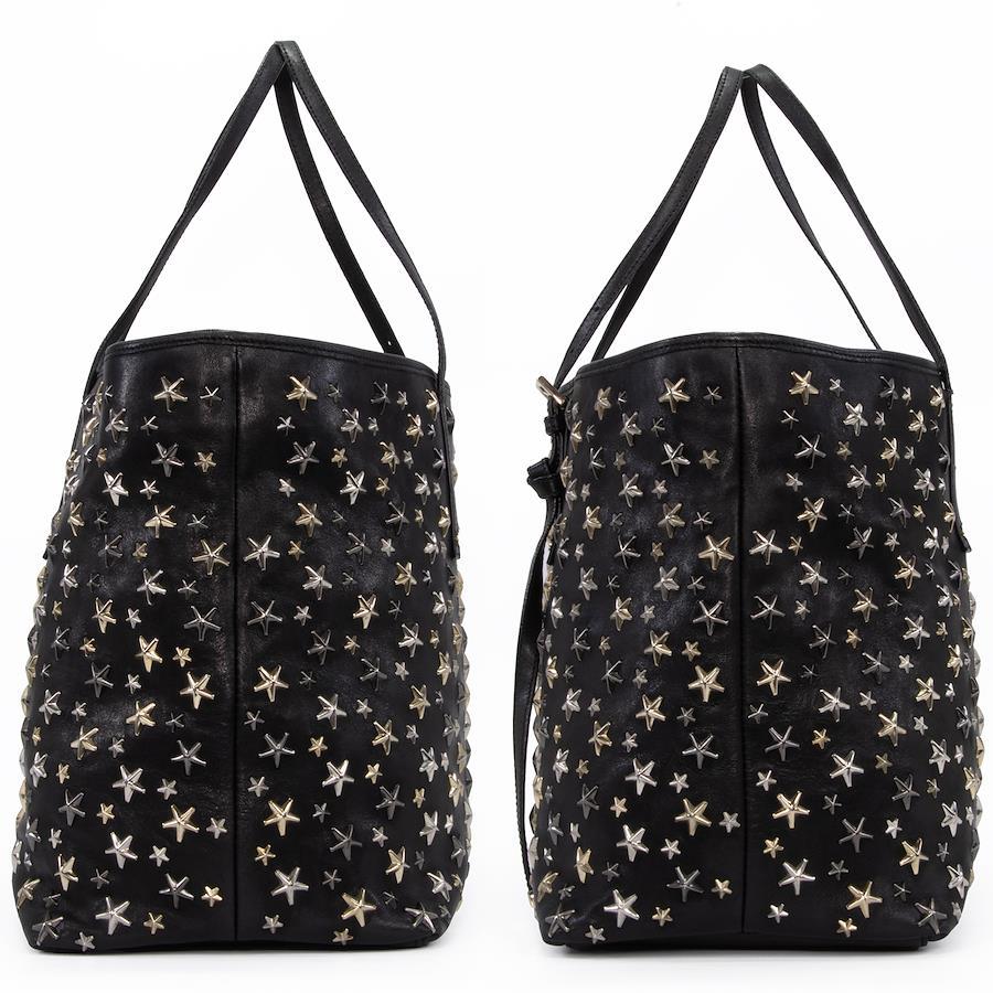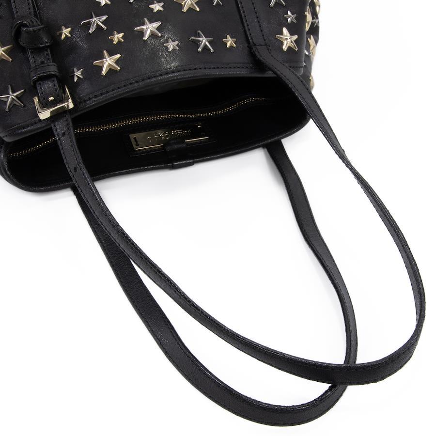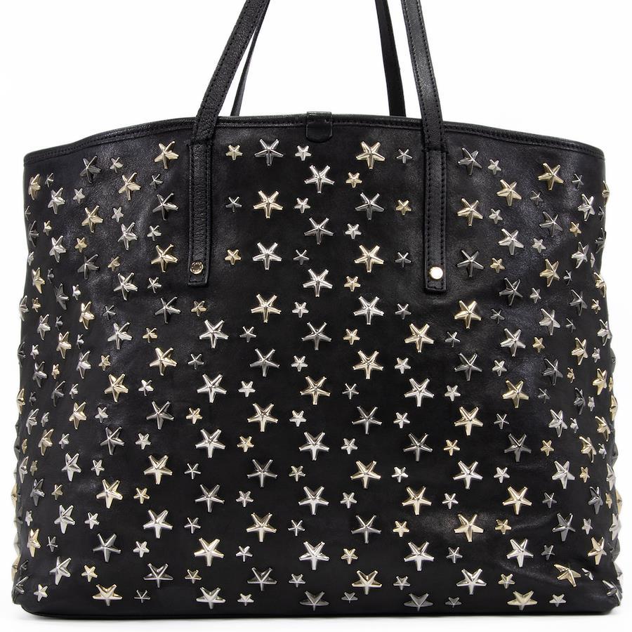 Authentic JIMMY CHOO Sasha M sheepskin handbag/tote/semi-shoulder bag for women, metallic mix black, rare model from the 2000s. A4-compatible, shoulder bag with a star design, tri-color star studs, and a logo. Beautiful, high-end, stylish bag, model E433.