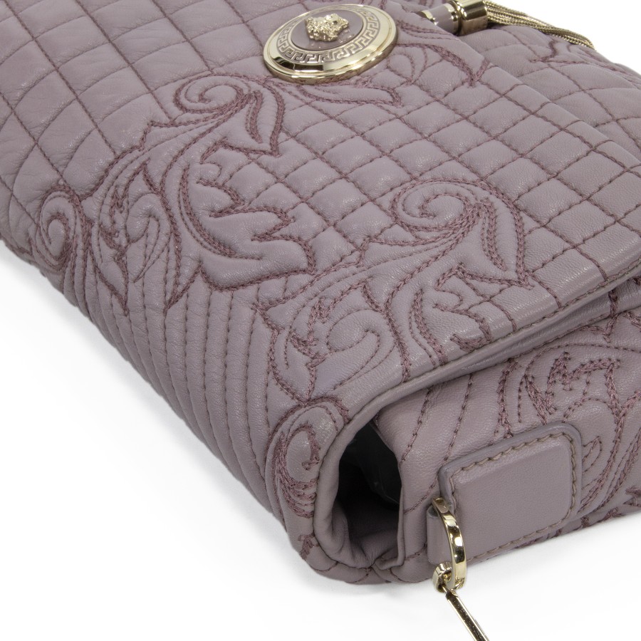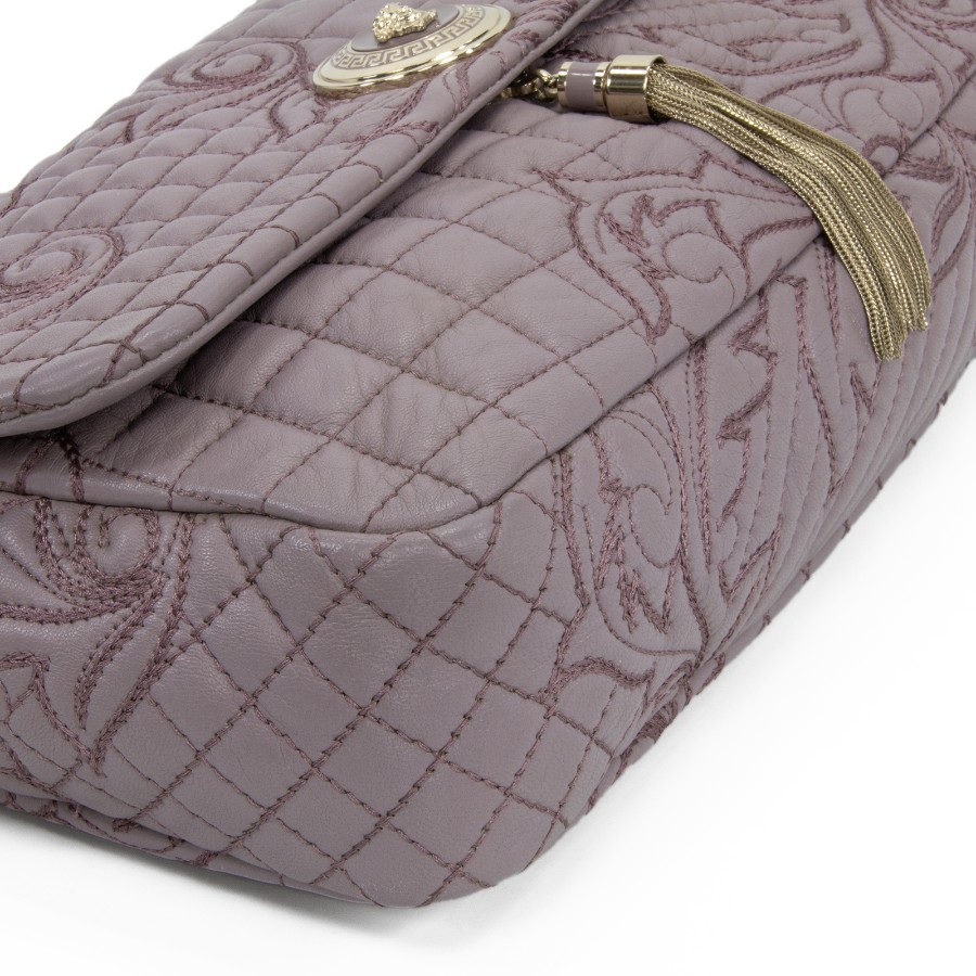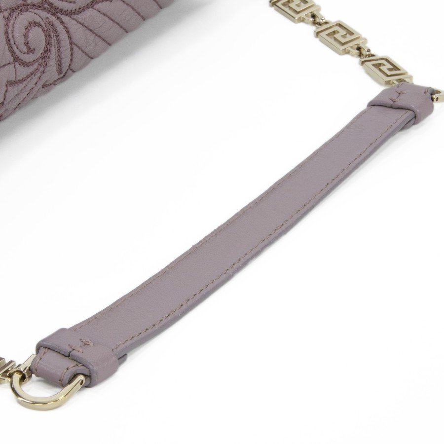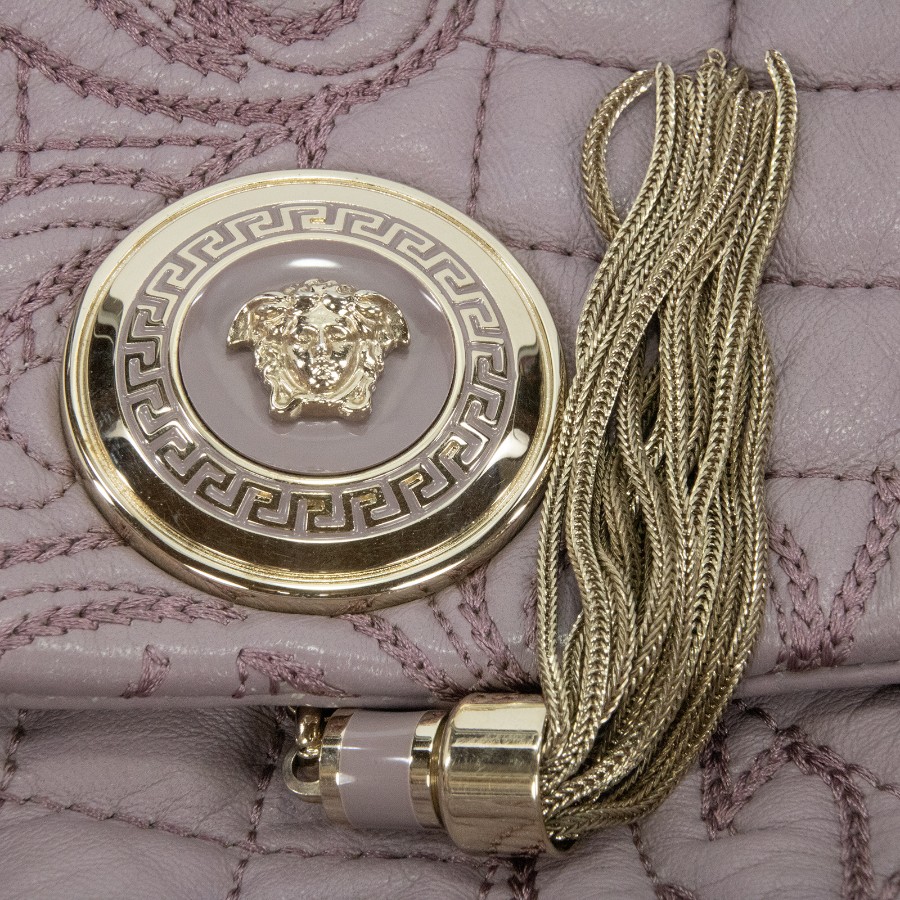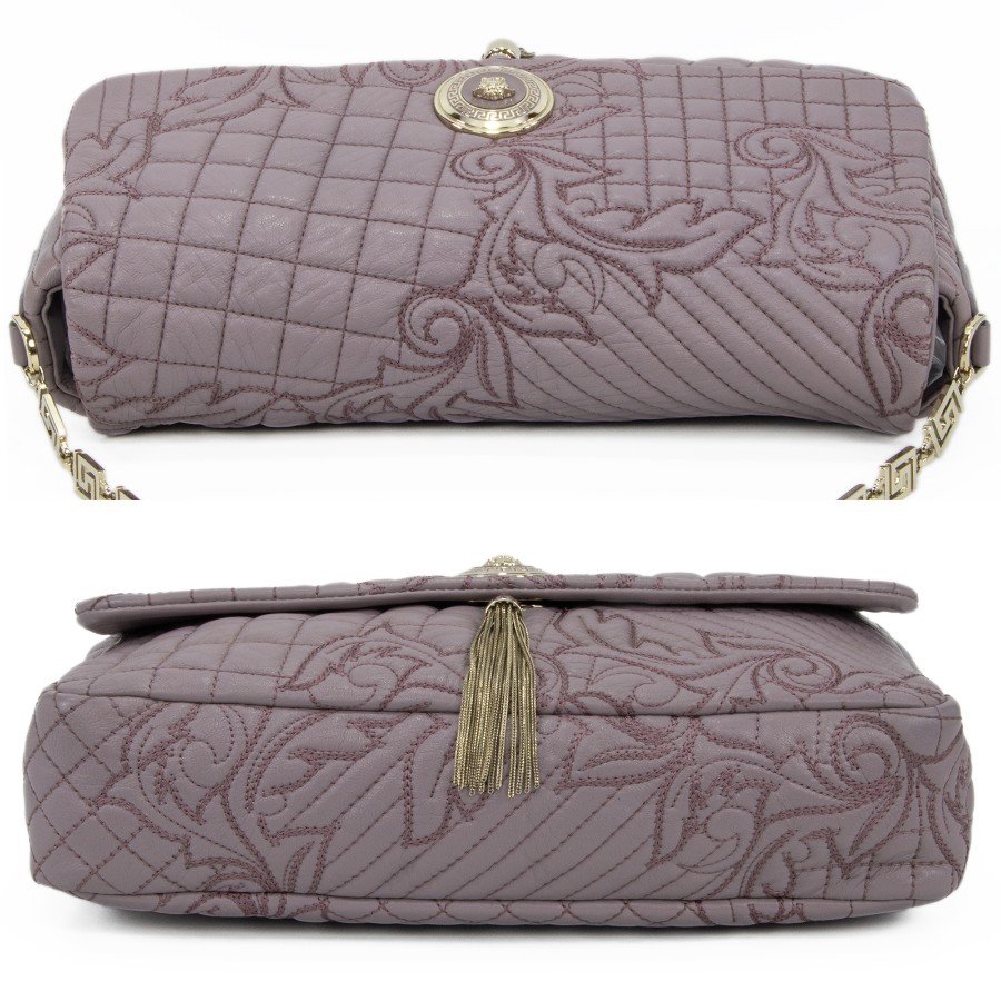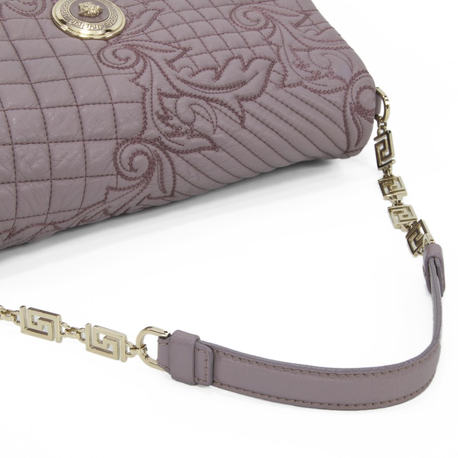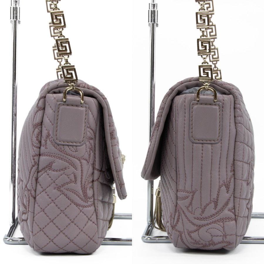 グレカ柄・バロッコ・キルティング・メデゥーサと、一目でヴェルサーチェとわかる要素が贅沢の極みと言えるほどあしらわれており、バッグをお使いいただくたびにうっとりさせられます。