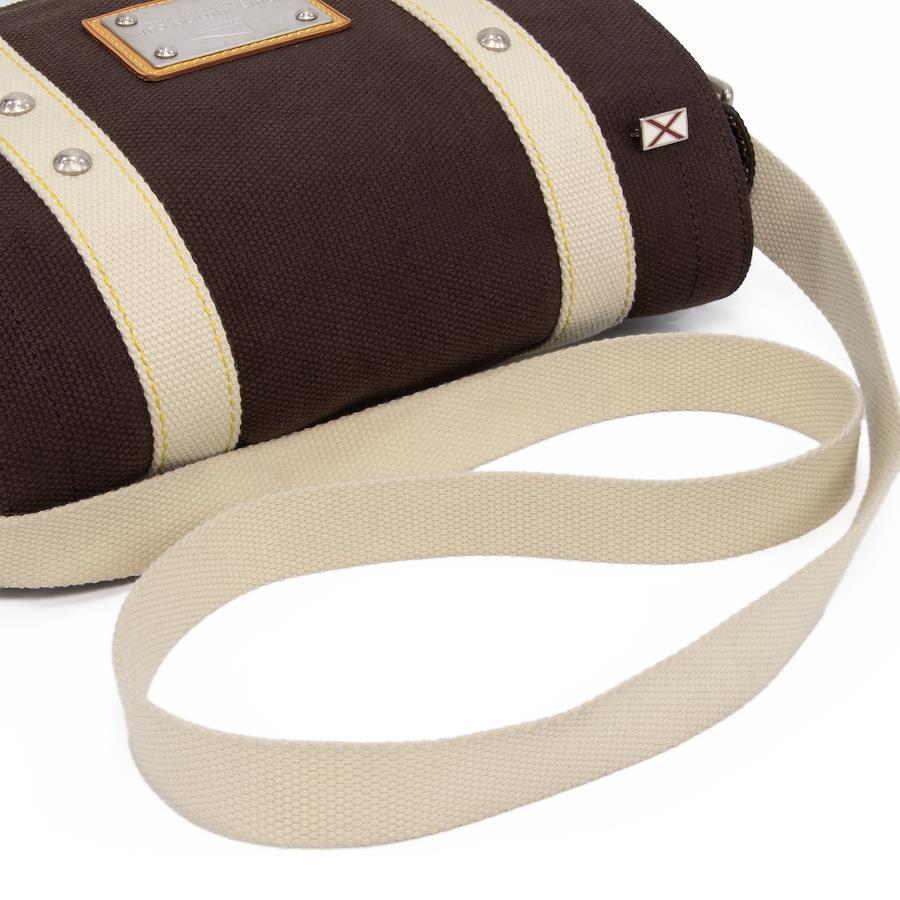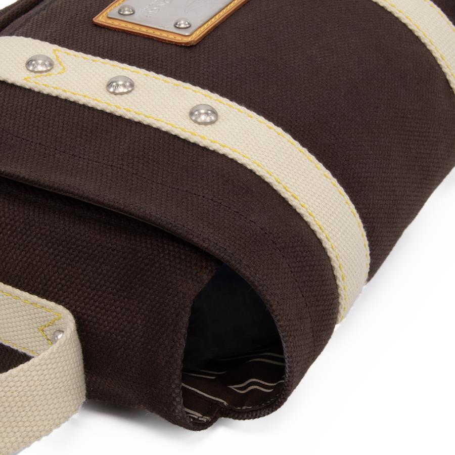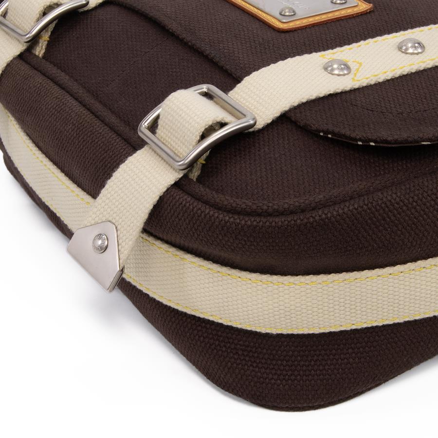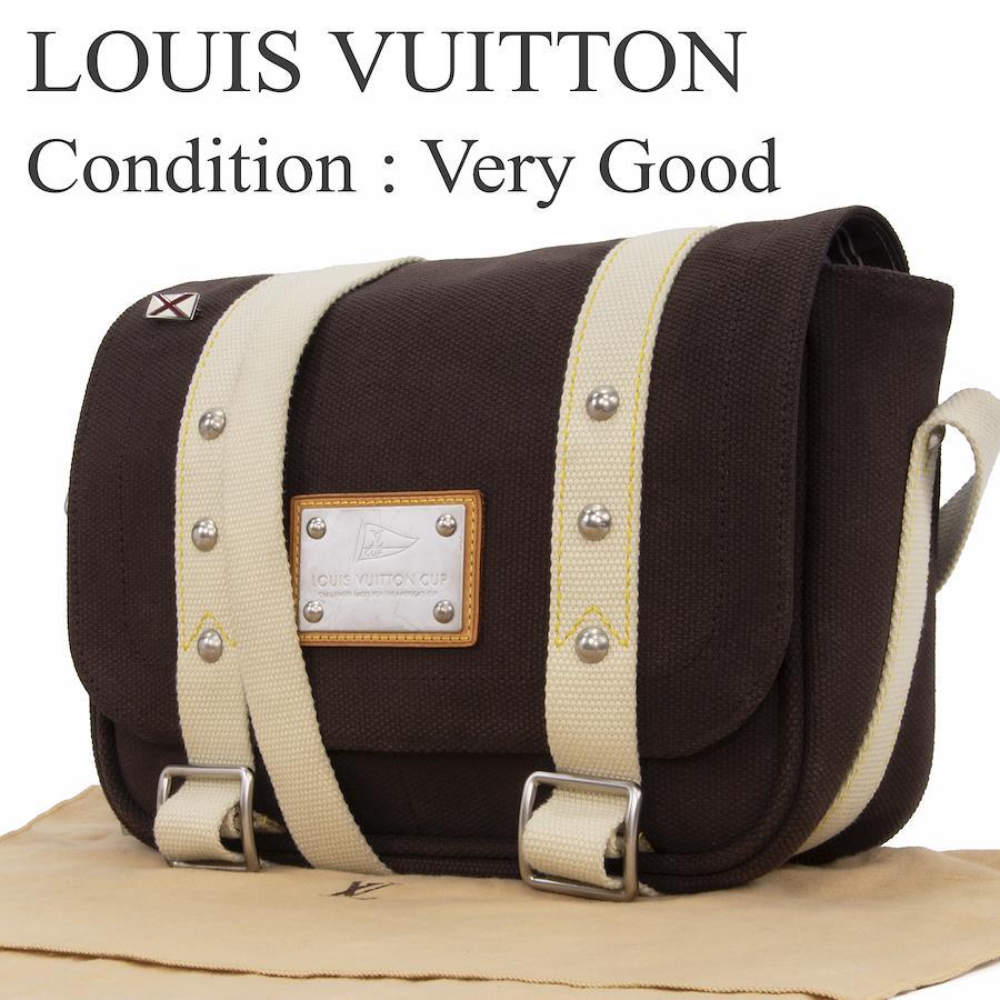 Authentic LOUIS VUITTON semi-shoulder bag, one-shoulder bag, or crossbody bag for men and women. Made of canvas and tanned leather, the Bezas PM Antigua Louis Vuitton Cup features a two-tone dark brown and ivory design. This rare and unusual model can be worn on the shoulder or across the body. Features a logo plate, badge, and studs, as well as genuine leather and silver hardware. A beautiful, high-end, stylish bag. Product number I274.