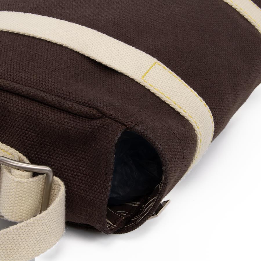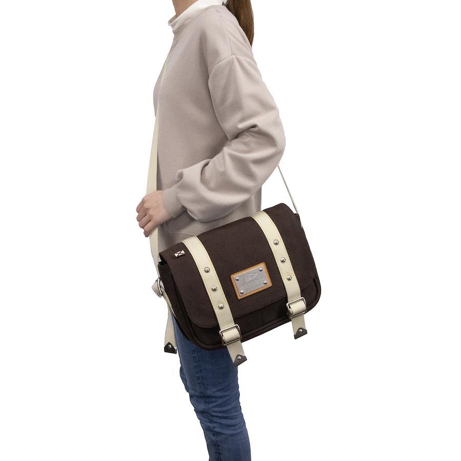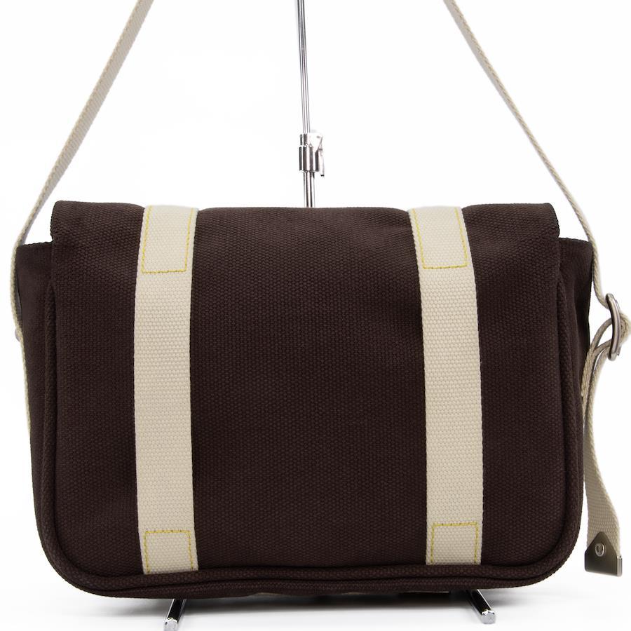 ダークブラウンのキャンバス地に、爽やかなアイボリーのストラップが映える、スポーティーかつエレガントな佇まいでございます。