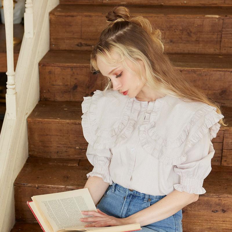 大人気の大きなセーラー襟ブラウスに半袖が登場。【デザイン】二枚重なった大きなセーラー襟がポイントのブラウスです。今回の半袖バージョンは、ボタンがシンプルなさりげないお花カットになっているのがポイントです。袖口はゴムでぽわっとした袖になってくれてガーリーで可愛いです。【素材】コットン素材です。袋に入れてお届けのため、届いたときのしわ感が気になると思いますが、ハンガーにかけていただいたり、アイロンでしわを伸ばしていただくことをおすすめいたします。裏地は無く、濃色下着が透ける可能性がありますので、インナーの着用をおすすめいたします。【コーディネート】Roseのボトムスと相性が良いです。ジャンスカの下に着ていただいても可愛いです♪コットン素材なので、これからの季節のお出かけに大活躍してくれるブラウス間違いなしです。《透け感》カラーによってあり 《生地の厚さ》薄手 《裏地》なし 《伸縮性》なし《生産国》中国