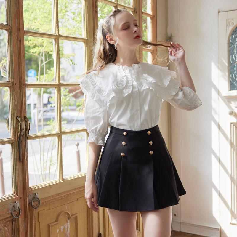 大人気の大きなセーラー襟ブラウスに半袖が登場。【デザイン】二枚重なった大きなセーラー襟がポイントのブラウスです。今回の半袖バージョンは、ボタンがシンプルなさりげないお花カットになっているのがポイントです。袖口はゴムでぽわっとした袖になってくれてガーリーで可愛いです。【素材】コットン素材です。袋に入れてお届けのため、届いたときのしわ感が気になると思いますが、ハンガーにかけていただいたり、アイロンでしわを伸ばしていただくことをおすすめいたします。裏地は無く、濃色下着が透ける可能性がありますので、インナーの着用をおすすめいたします。【コーディネート】Roseのボトムスと相性が良いです。ジャンスカの下に着ていただいても可愛いです♪コットン素材なので、これからの季節のお出かけに大活躍してくれるブラウス間違いなしです。《透け感》カラーによってあり 《生地の厚さ》薄手 《裏地》なし 《伸縮性》なし《生産国》中国