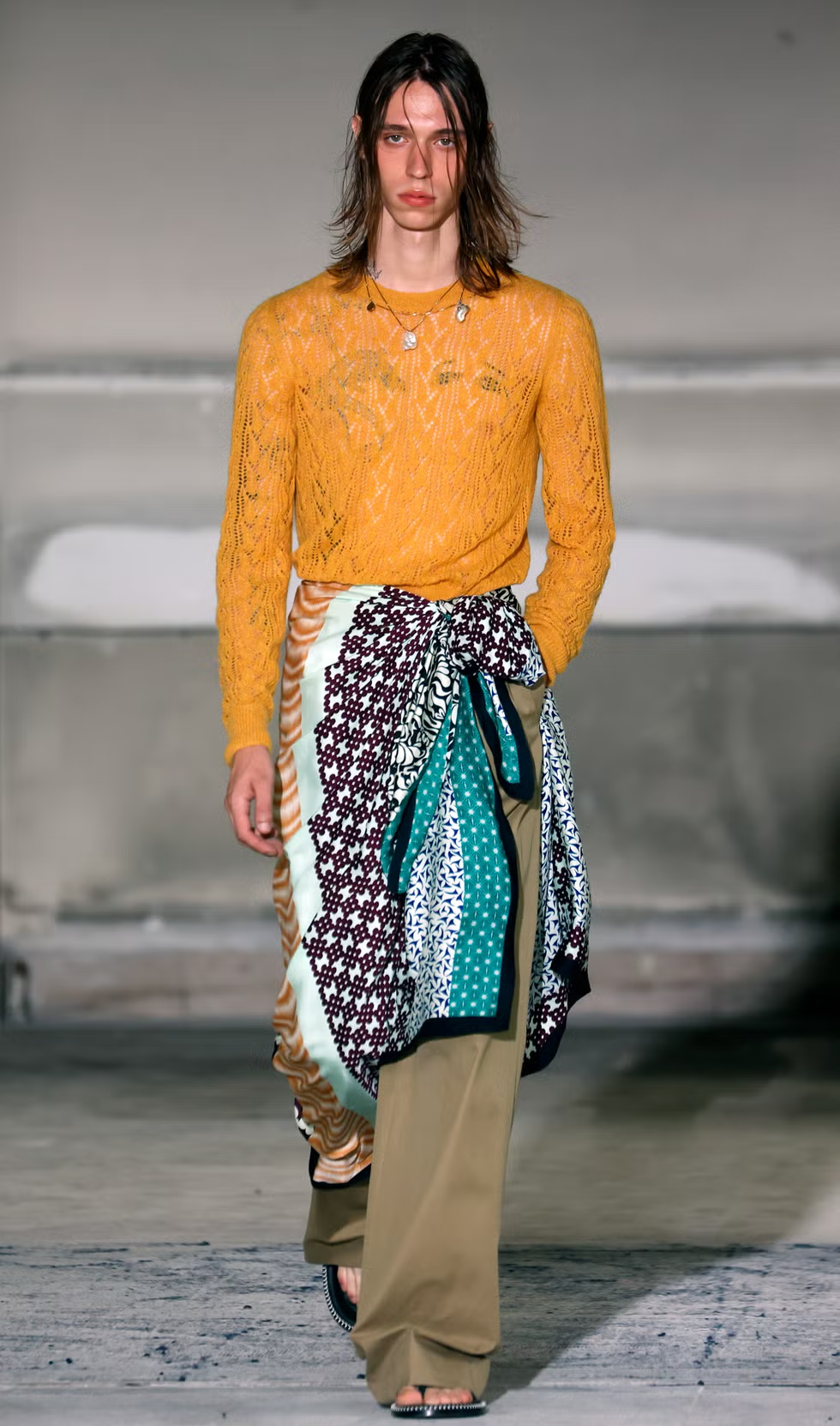 At Paris Men’s Fashion Week for Spring 2026, Julian Klausner made a splash with his very first menswear line for Dries Van Noten—think shimmering tank tops, soft tailoring, and perfectly cinched waists (per Harper's BAZAAR). One of the most buzzed-about styling tricks? Sarongs or pareos, wrapped effortlessly over crisp, tailored trousers for an effortlessly cool twist.
