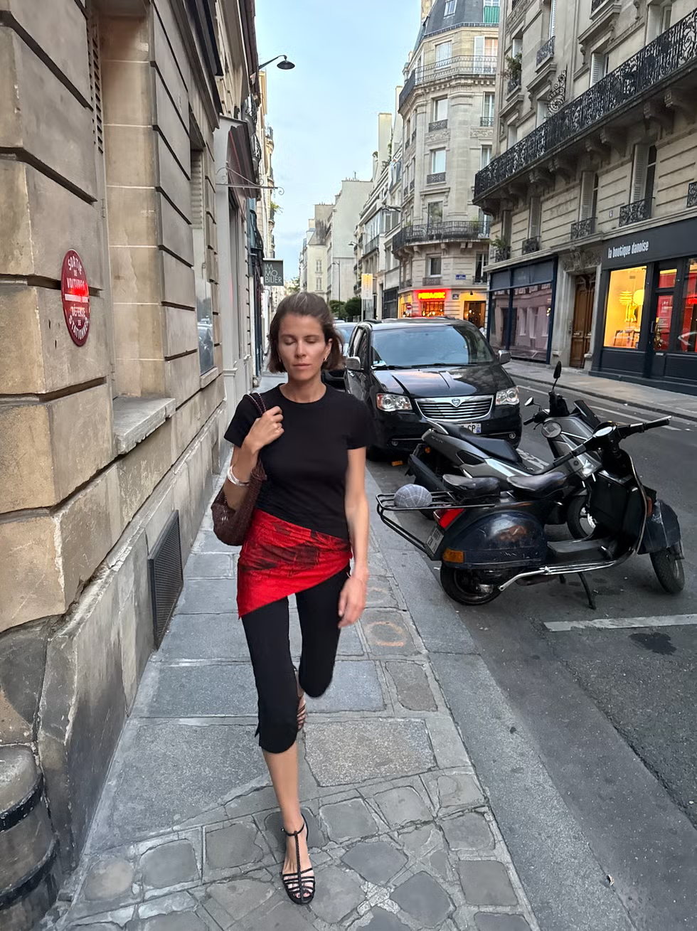 Monica de La Villardière—writer, influencer, and full-on style muse—was spotted in Paris with a bright red silk scarf topping her fitted black tee and slim capris.