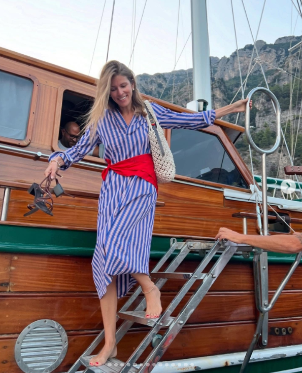 De La Villardière has been experimenting with this scarf idea more than once. For a recent boat trip, she tied a simple red scarf at her right hip over a long blue-and-white striped shirt dress. “It’s as summer-y as you can get,” she raved.