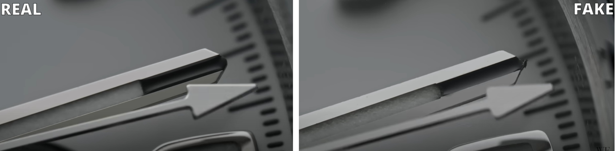 Many fakes give themselves away with sloppy execution. The text often looks uneven, the numerals don’t match in size or shape, and the whole thing lacks the refinement you’ll instantly notice on the real deal.
