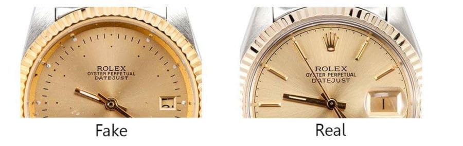 On a genuine Rolex, the printing is razor-sharp and flawless. With counterfeits, it might look fine to the naked eye, but once magnified, the lettering reveals itself as flawed.