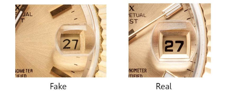 If the date lens feels convex and rises like a solid bump above the crystal, that’s a reassuring sign of authenticity. A flat lens, however, usually signals a fake. Another red flag? When the date isn’t magnified—or barely magnified at all.