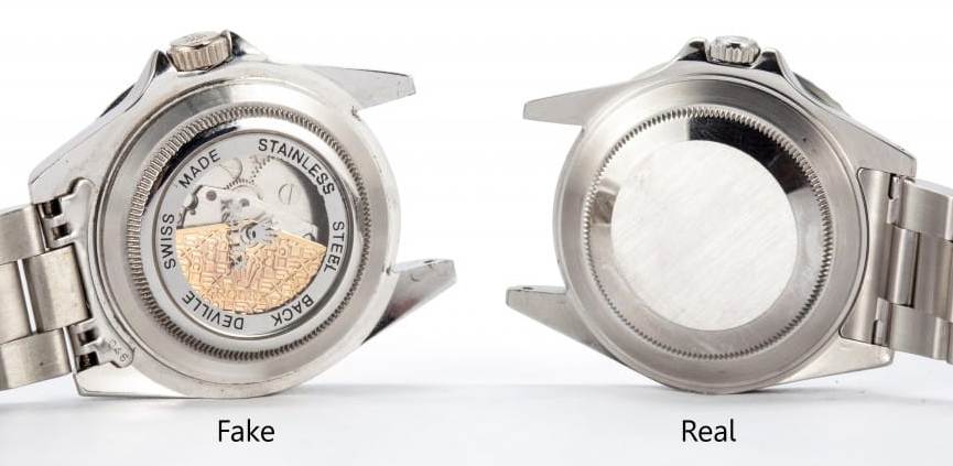 Conversely, spotting a transparent case back on a Rolex is almost always a giveaway of a fake. A see-through case back is actually a favorite trick of counterfeiters, meant to dazzle potential buyers with the spectacle of the watch movement.