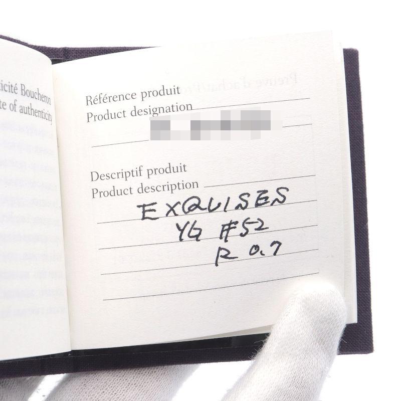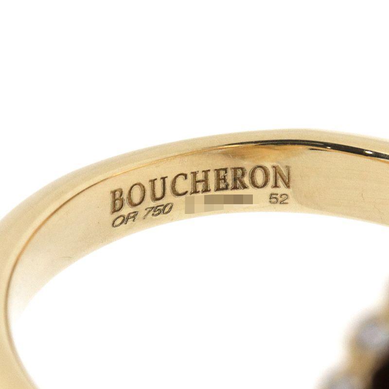 Brand: BoucheronProduct Name: Exquis Confidence Ruby RingModel Number:Size: #52, Actual Measurements: Approximately 11.5, Motif: Approximately 13.2mm x 14.0mm, Arm Width: 2.4mm-3.0mmStamp: BOUCHERON OR750, Serial No.: 52Material: 18K Yellow Gold, Ruby, DiamondWeight: 13.6gList Price:Accessories: Dust bag, Warranty card (October 2007) (Domestic genuine stamp)Condition Rank: A-There is a dent on the arm.Comment: This item has been authenticated and is authentic.