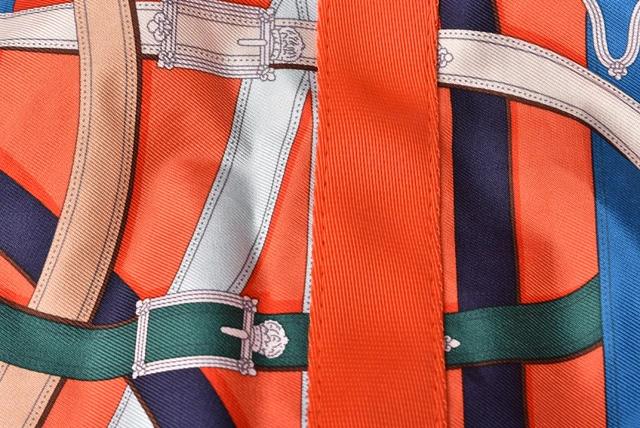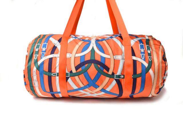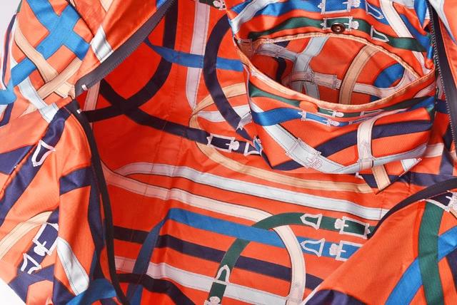 エルメスより、ショッピングバッグです。スカーフでも人気の柄カヴァルカドゥール!美しいシルクプリント。オレンジを基調にマルチカラーが映えます。 軽量で折りたたむとポケッタブルになるので、ショッピングや旅行などの持ち運びに最適です。内側のポケットに、コンパクトに収まります。