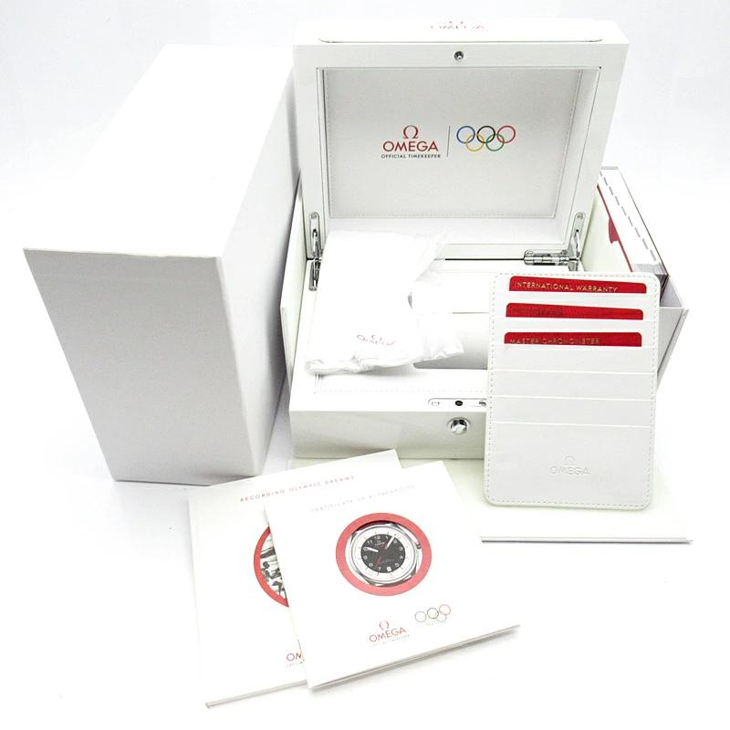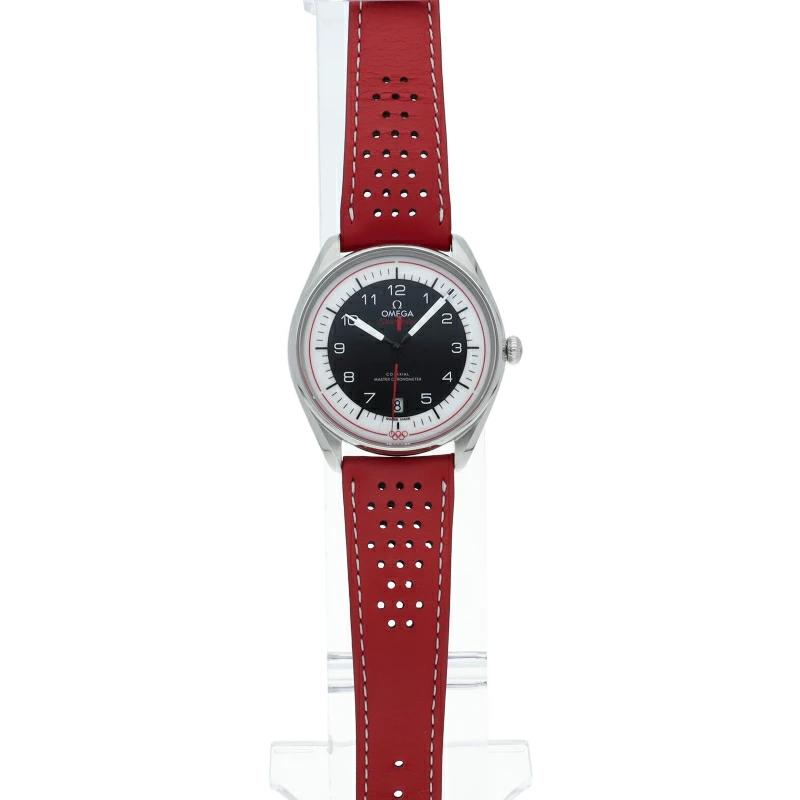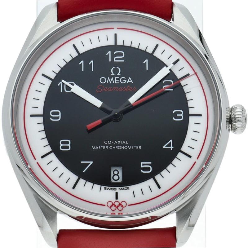 | オメガが1932年から行っているオリンピックのオフィシャルタイムキーパーの2032年に100周年を迎えることを記念した特別なモデル五輪マークをモチーフとした5色からなるモデルでこちらはブラック1976年のモントリオール大会とインスブルック大会で使用されたストップウォッチがモチーフとなっています。ダイアル外周の円は、20秒間隔で3つに区切られており心拍数を簡単に計算することが可能です。 |