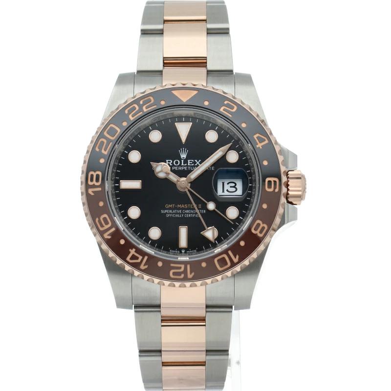 | セラクロムベゼルでのGMTマスター2。ロレックスの最新ムーブメント「Cal.3285」を搭載しており、エネルギー効率が最適化されたクロナジー脱進機、テンプを衝撃から守る為の耐震装置パラフレックス ショック・アブソーバそして70時間ものロングパワーリザーブとロレックスの最新技術を駆使したムーブメントになっています。 |