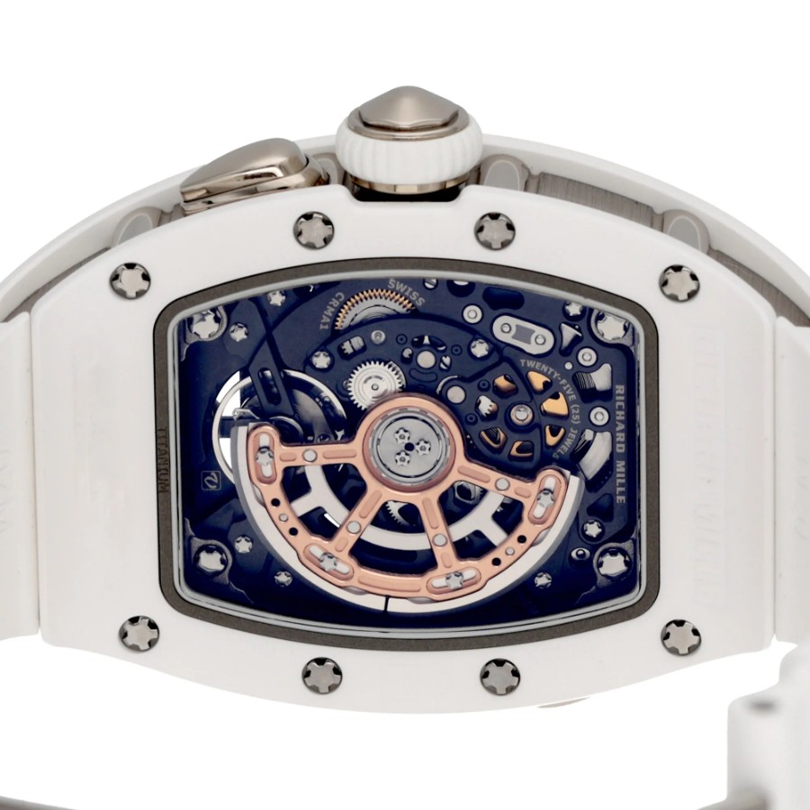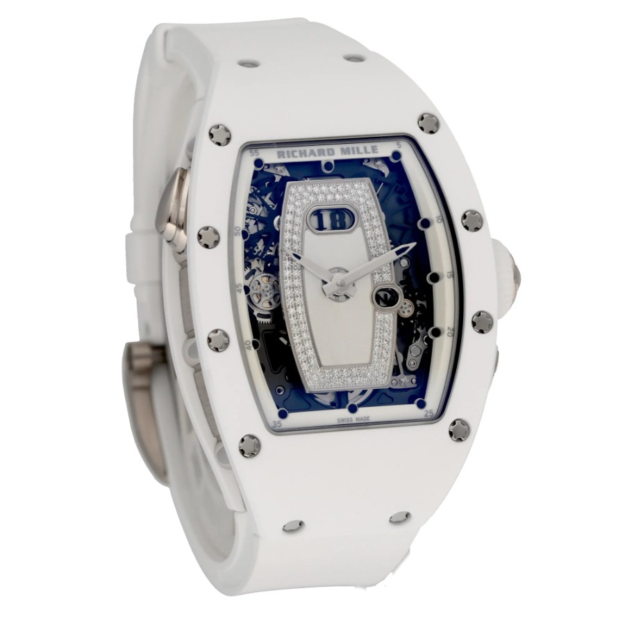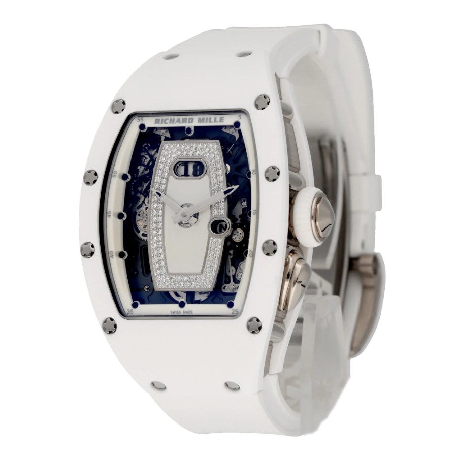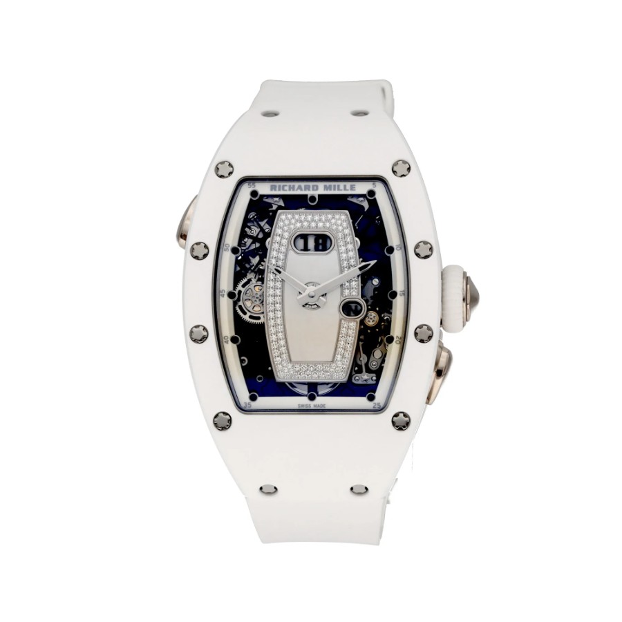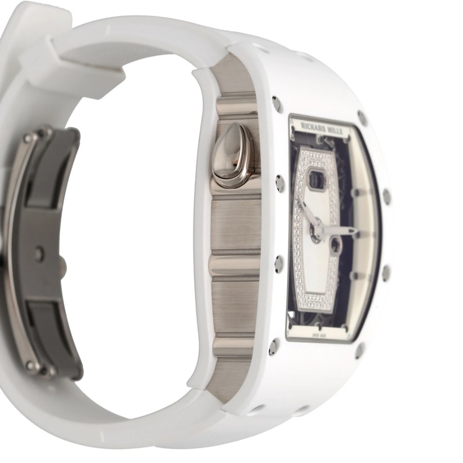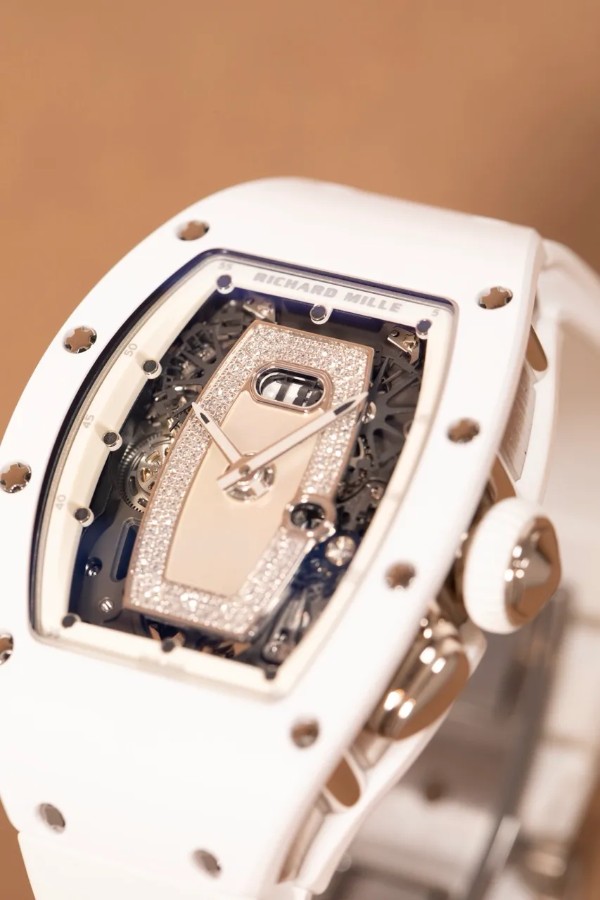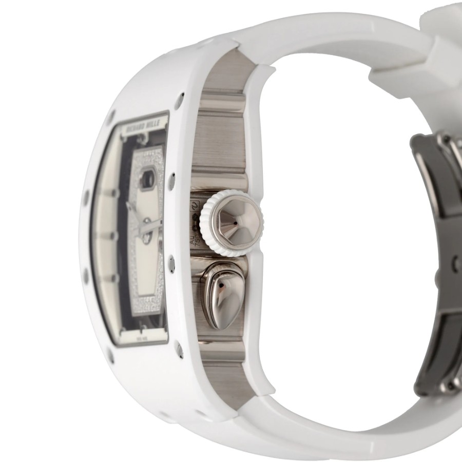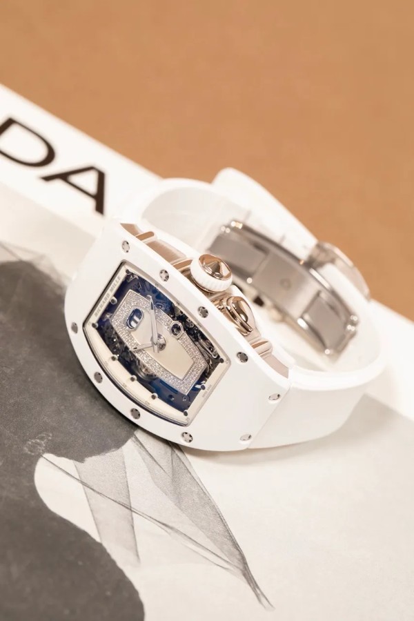 --------【商品スペック】--------お問合せコード:RM 037ブランド:リシャール ミルシリーズ:ATZホワイトセラミックケース素材:ATZホワイトセラミック × 18Kホワイトゴールドベルト素材:ホワイトラバーダイアルカラー:ダイヤモンド マザーオブパールムーブメント:自動巻き(Cal.CRMA1)ケースサイズ:34mm(リューズ除く)防水:50mガラス:サファイアクリスタル仕様:時・分表示、オーバーサイズデイト、ファンクションセレクター付属品:国際保証書(2025年)保証:当店購入日より3年保証メーカー参考価格:時計製造の常識を覆し続けるリシャール・ミルが、女性のために紡いだ至高の傑作――RM 037。ホワイトセラミックと18Kホワイトゴールドという二つの素材が生み出す純白の輝きは、リシャール・ミルの革新的な技術と宝飾芸術の極致が交差する、唯一無二の存在感を放ちます。航空宇宙産業にも用いられる最先端素材と、スイス時計製造の粋を結集した精緻なムーブメントが融合した本作は、驚異的な軽量性と卓越した耐久性を両立しながら、女性の手首に氷のごとく清冽な美しさをもたらします。ホワイトセラミックが持つ傷や退色への高い耐性は、その純白の輝きを長年にわたり保ち続け、18Kホワイトゴールドの冷艶な気品とともに、纏う者の品格をさらなる高みへと引き上げます。真の時計愛好家のみが知る孤高の美学を体現した、時計芸術の極致です。