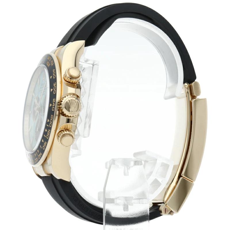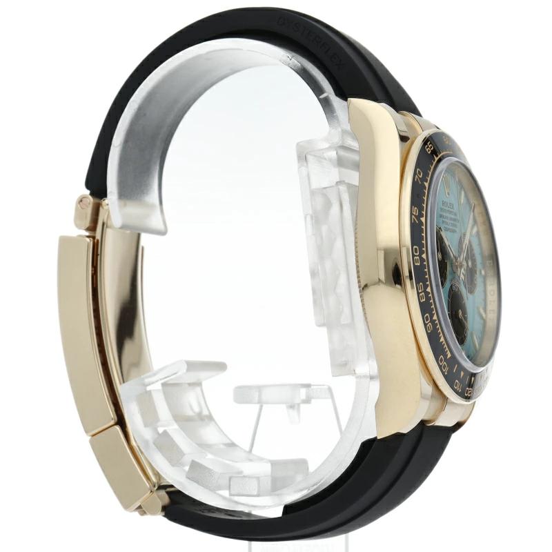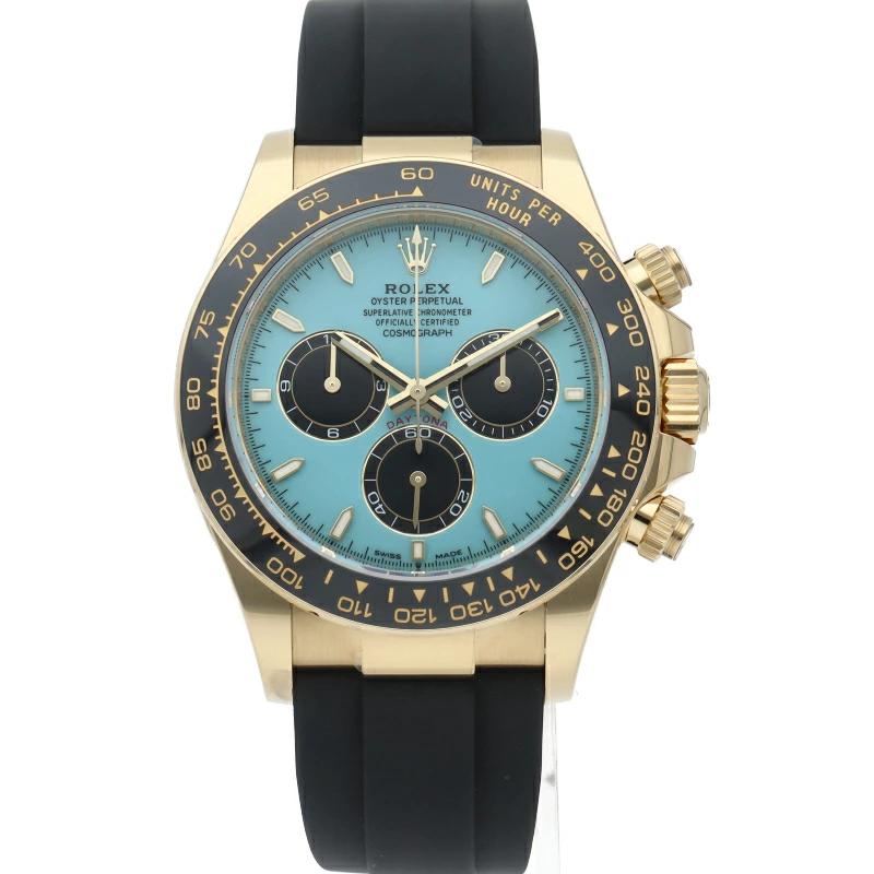 | 18Kイエローゴールドのケースに、鮮烈なターコイズブルーのラッカーダイアルが映えるデイトナ。ブラックのインダイアルがアクセントとなり、視線を集めるデザインです。Cal.4131ムーブメントを搭載し、機能性も抜群。ラグジュアリーと個性を両立した注目のモデルです。 |