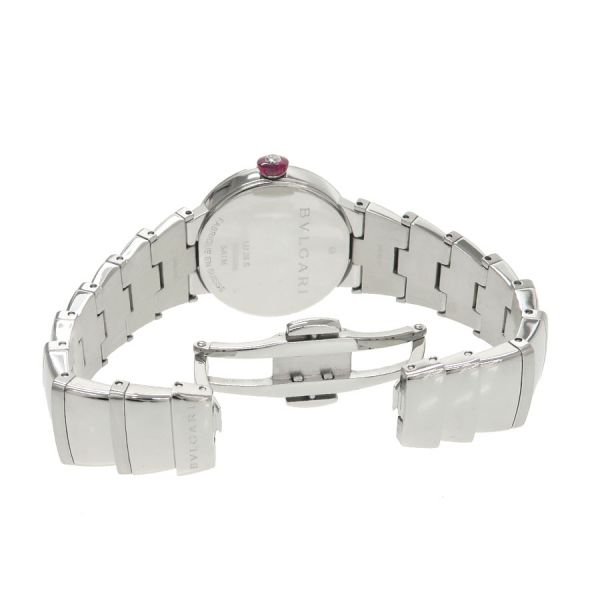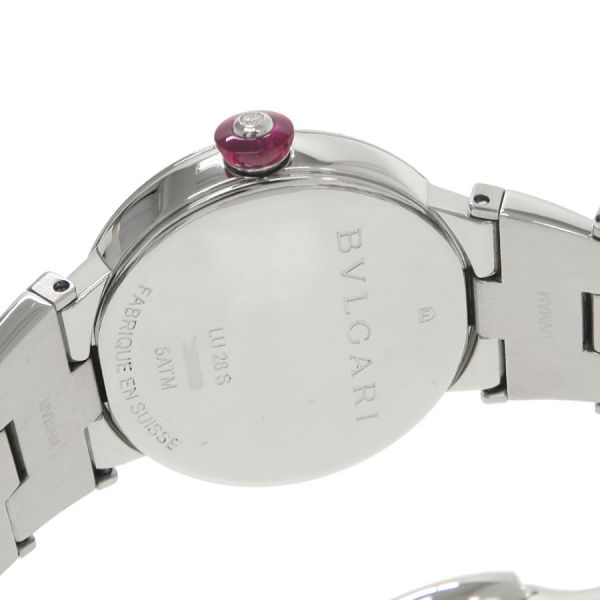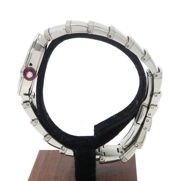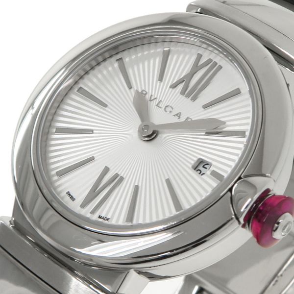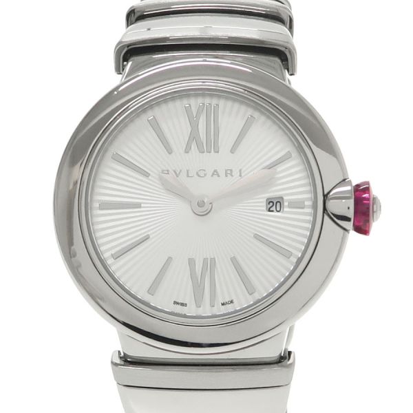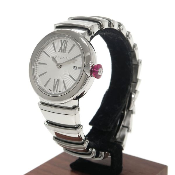 ブルガリの創業130周年を迎えた2014年から発売された「ルチェア」が入荷しました。こちらはケース径が28ミリ、放射状のギョーシェ彫りが施されたシルバー文字盤でどんなシーンにもお使いいただけます。シンセティックサファイアを使用したベリー型の赤いリューズや、リューズの中央のダイヤモンドが大変マッチしています。当社提携の時計修理工房にて外装の仕上げと電池交換を行っております。ベゼルに擦れ、裏蓋に小キズ、ブガラスに目立たない程度ですが擦れがございます。